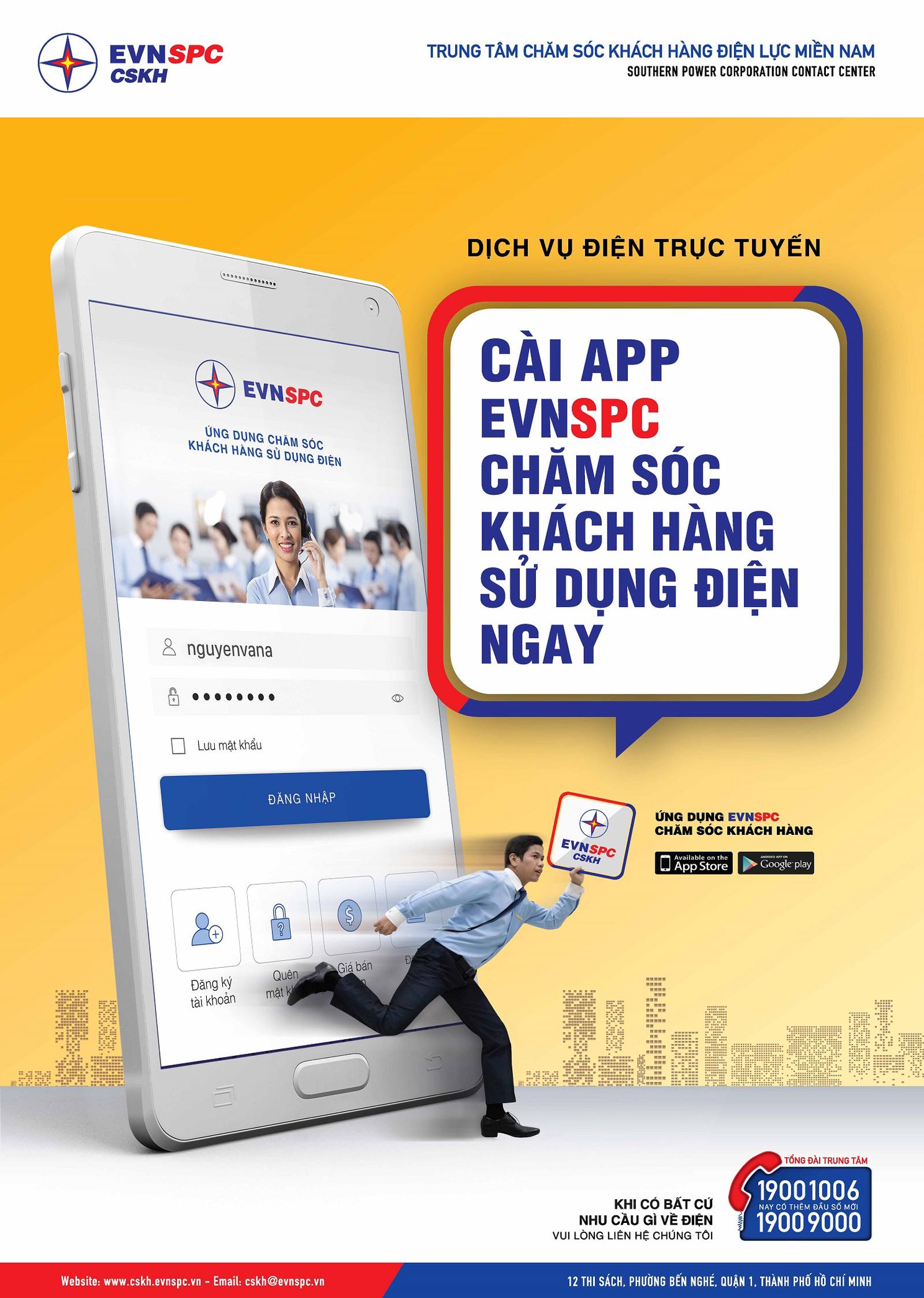 Tổng đài chăm sóc khách hàng (CSKH): 19001006 hoặc 19009000; Website CSKH: https://cskh.evnspc.vn ; Email CSKH: cskh@evnspc.vn. Ứng dụng CSKH trên thiết bị di động qua App Store (EVNSPC CSKH); Ứng dụng Zalo Official CSKH: TCT Điện lực miền Nam EVNSPC; Cổng dịch vụ công Quốc gia: https://dichvucong.gov.vn .