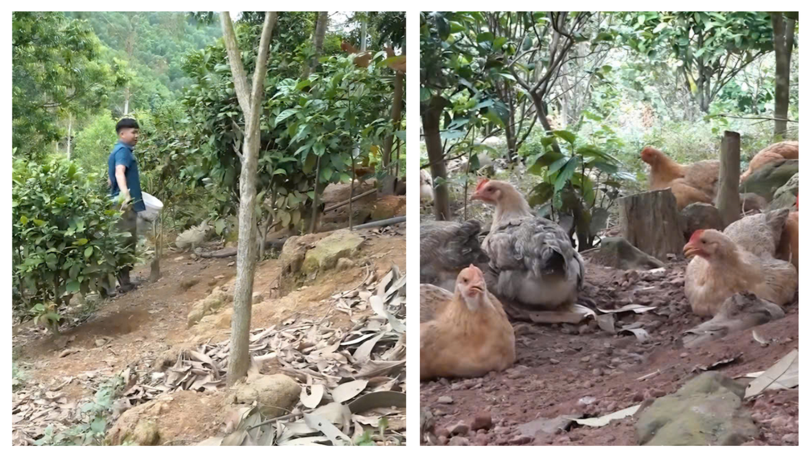 Khi thấy chính quyền khuyến khích phát triển sinh kế dựa trên cây bản địa, anh mạnh dạn dựng chuồng trại, thả gà tự nhiên trên nền đồi.