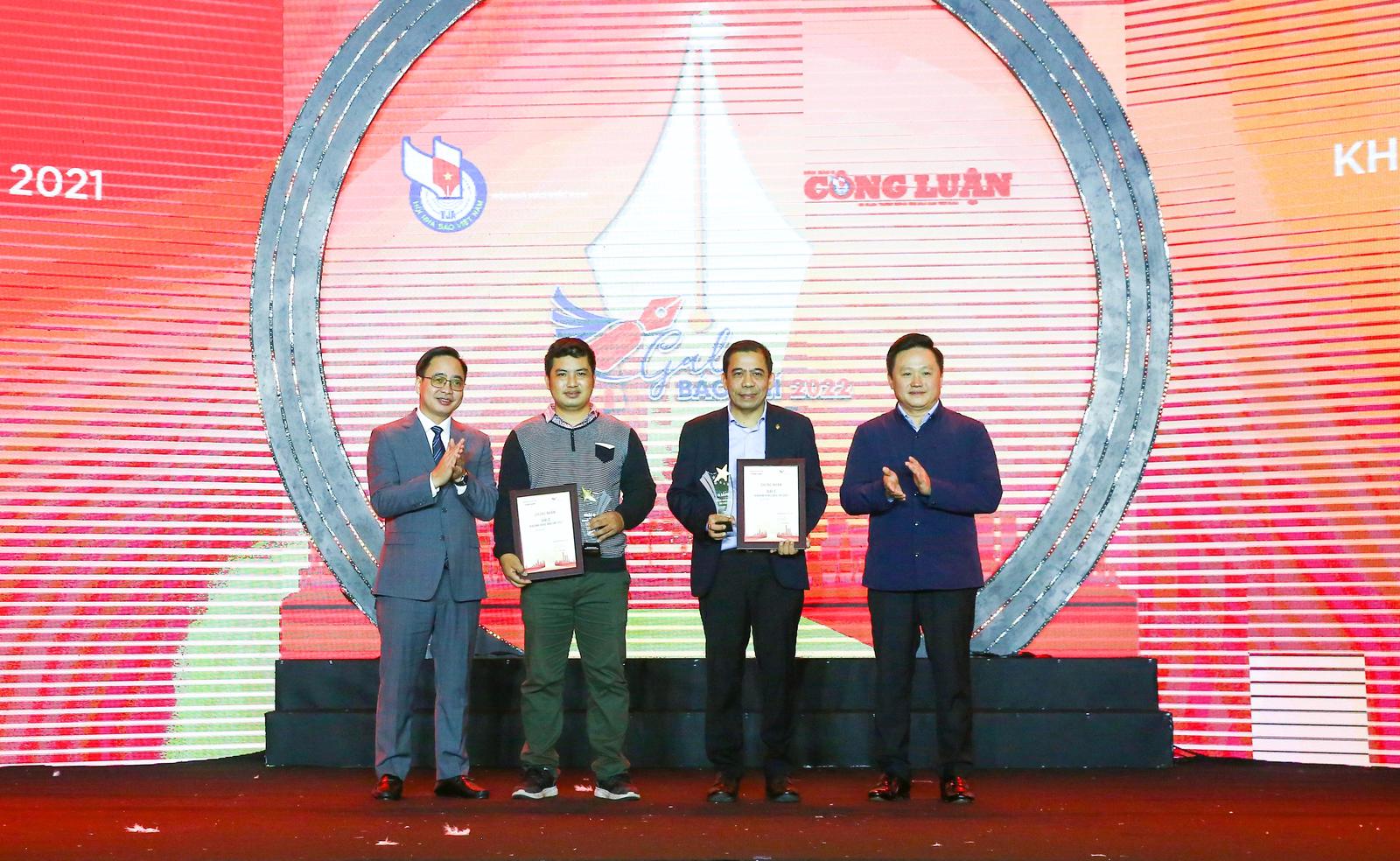 Ông Nguyễn Hồng Sâm, Tổng Giám đốc Cổng Thông tin điện tử Chính phủ (ngoài cùng bên trái) và ông Lưu Đình Phúc, Cục trưởng Cục Báo chí (ngoài cùng bên phải) trao giải cho top 10
