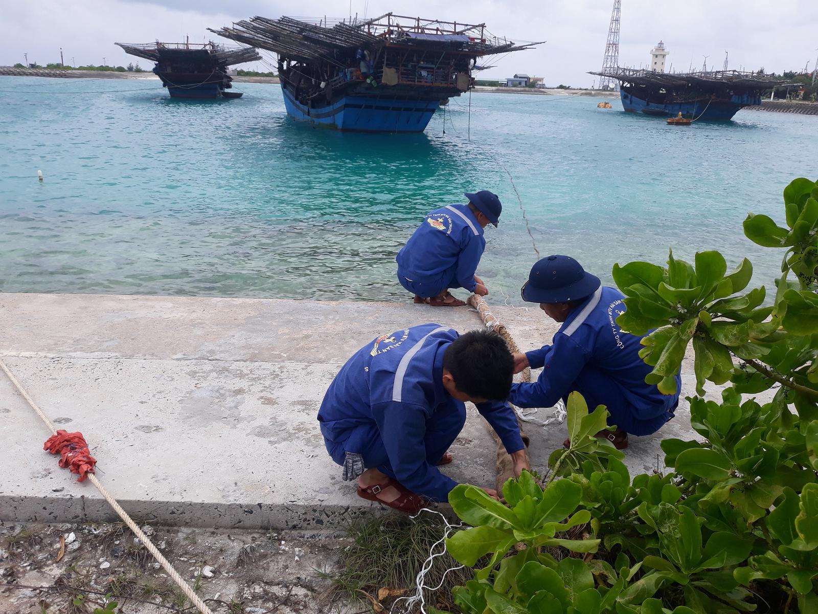 Bộ đội đảo Sinh Tồn giúp tàu câu mực Khánh Hòa buộc dây tàu neo vào đảo tránh bão. Ảnh: Đình Hoàng