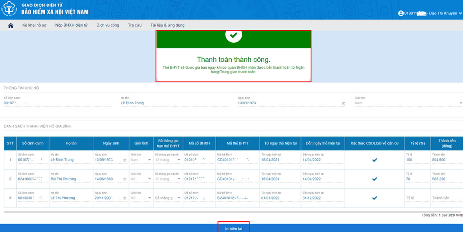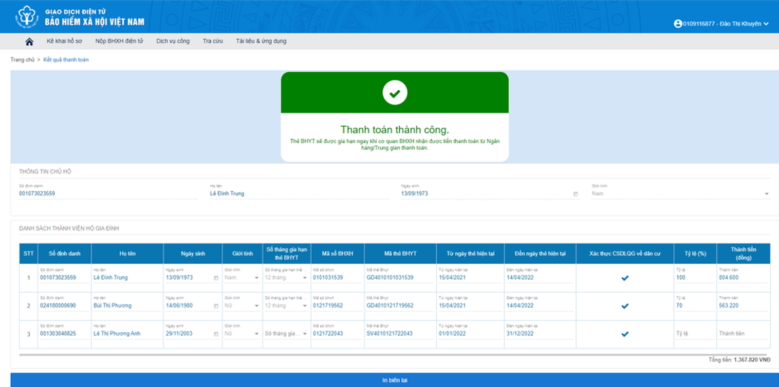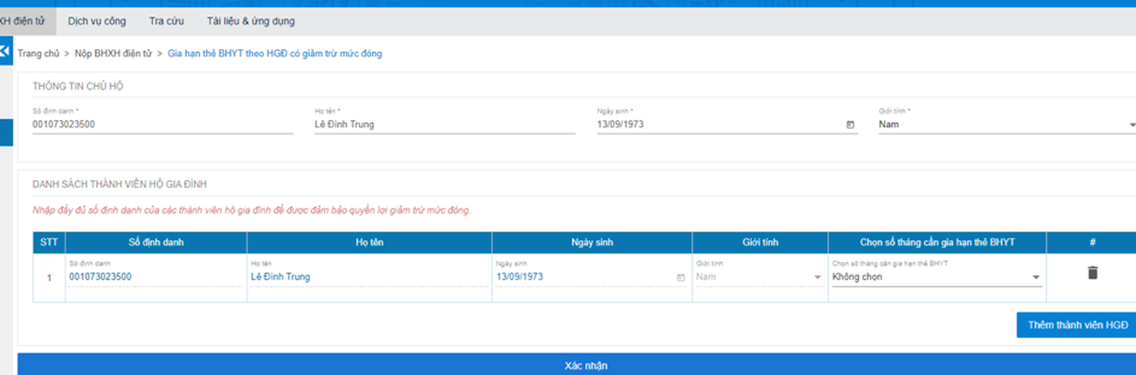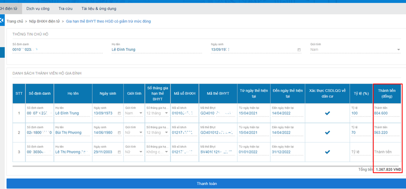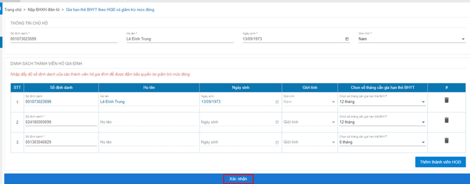 Nếu các thông tin: Thông tin chủ hộ; thông tin các thành viên; các thành viên tham gia thuộc đối tượng tham gia BHYT theo hộ gia đình; thông tin về thẻ BHYT của các thành viên; các thành viên đề nghị gia hạn thẻ BHYT tham gia ở cùng một cơ quan BHXH được xác thực là đúng, màn hình hiển thị thông tin như sau:
