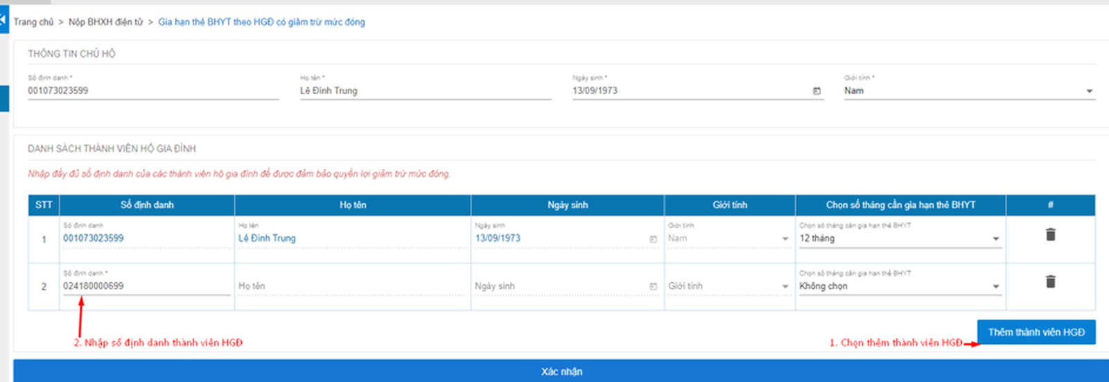 - Nhập thông tin các thành viên: Chỉ nhập số định danh