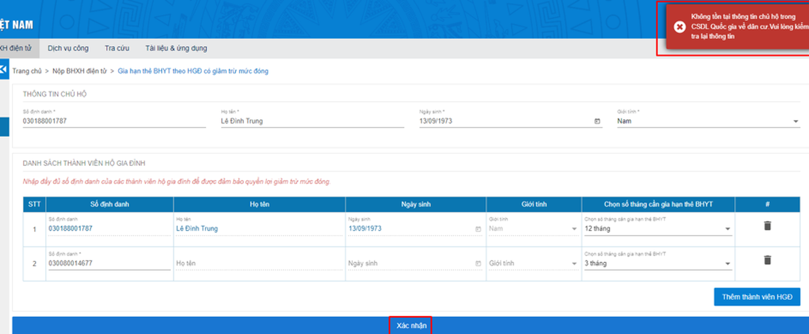 + Nếu thông tin về chủ hộ không tồn tại, khi xác thực hệ thống sẽ thông báo: