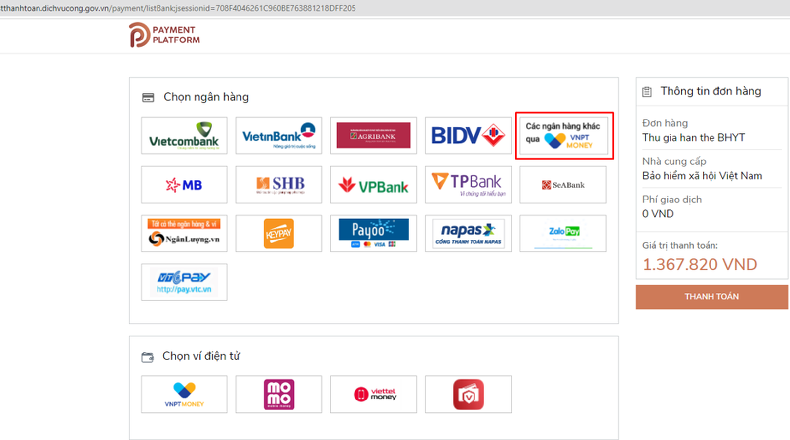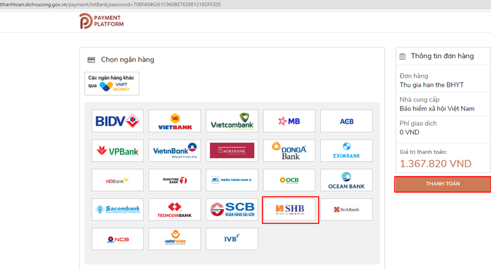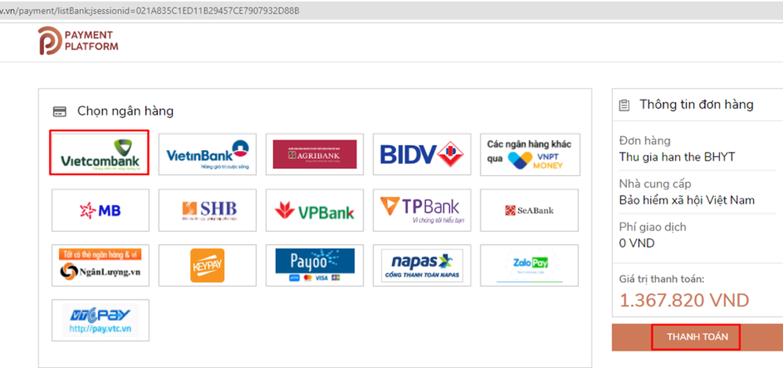 Sau khi chọn: “Thanh toán” tại Bước 6, Thực hiện chọn một Ngân hàng, chọn: “Thanh toán”