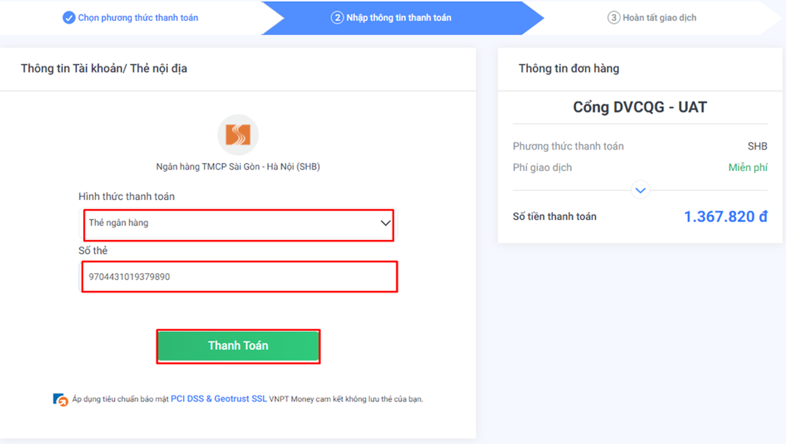 Thông tin thanh toán: chọn thẻ ngân hàng, nhập vào số thẻ, sau đó chọn: “Thanh Toán”