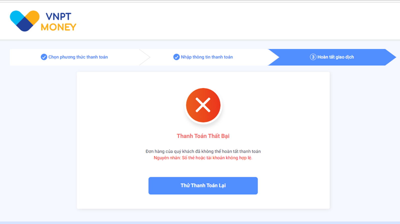 - Nếu thông tin thanh toán không đúng, hệ thống thanh toán sẽ thông báo như sau: