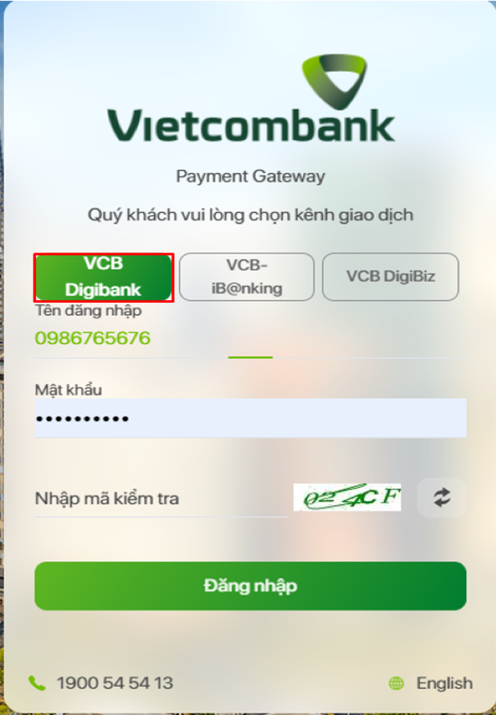 Hệ thống thanh toán của Ngân hàng yêu cầu nhập số điện thoại và mật khẩu của tài khoản để thanh toán.
