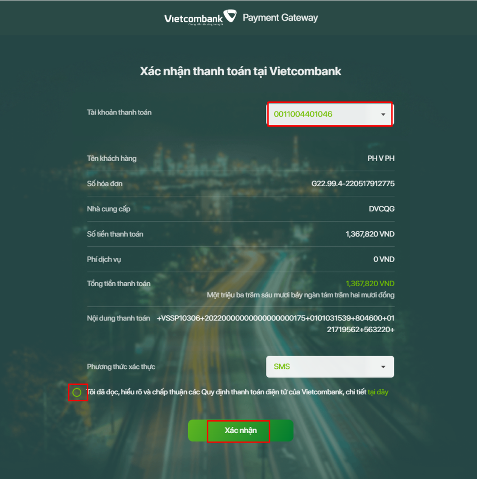 Nếu đăng nhập thành công, hệ thống yêu cầu chọn tài khoản và chấp nhận quy định thanh toán để xác nhận thanh toán.