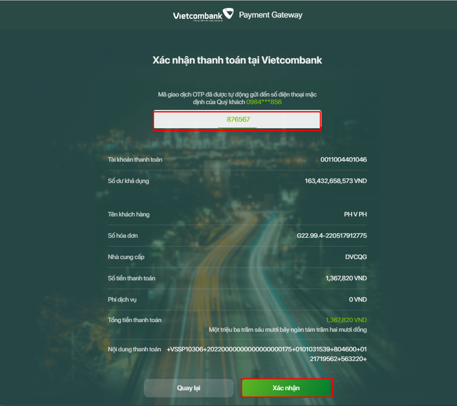 Sau khi chọn: “Xác nhận” tại Bước 7.2.2, hệ thống yêu cầu nhập mã OTP để xác thực thanh toán.