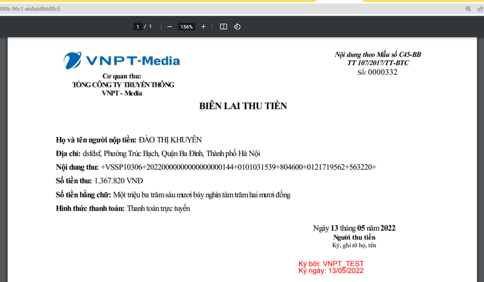 Sau khi thanh toán thành công, người dùng có thể thực hiện in biên lai bằng cách chọn: “In biên lai” màn hình hiển thị như sau: