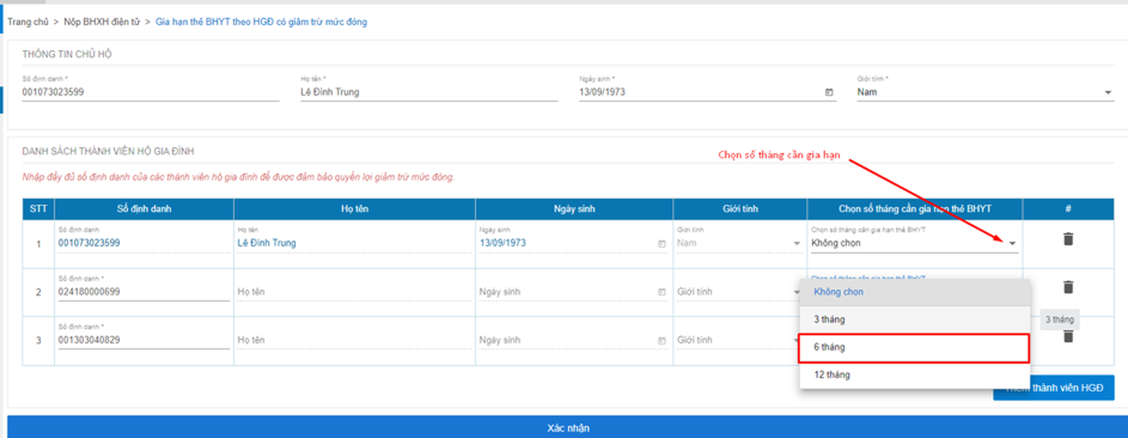 + Thông tin tham gia BHYT của từng thành viên: số định danh, họ tên, số tháng gia hạn, hạn thẻ BHYT hiện tại.