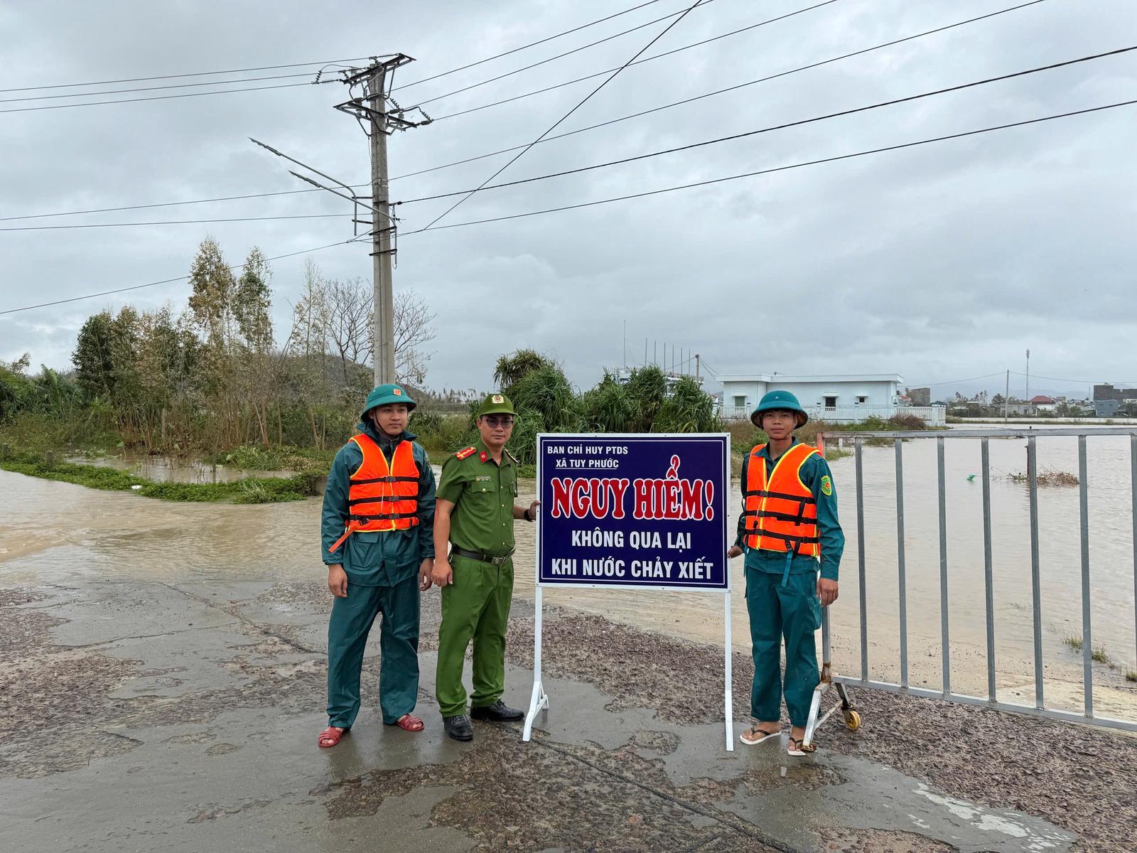 Công an xã Tuy Phước, tỉnh Gia Lai đã lập các chốt chặn cảnh báo lũ lụt nguy hiểm. Ảnh: CA