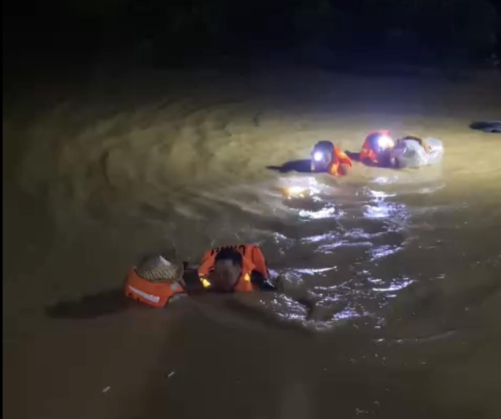 Vào lúc 23h10', ngày 18/11, các chiến sĩ Công an xã Tuy Phước, tỉnh Gia Lai vẫn dầm mình dưới dòng nước lũ chảy xiết để sơ tán người dân đến nơi an toàn. Ảnh: CA