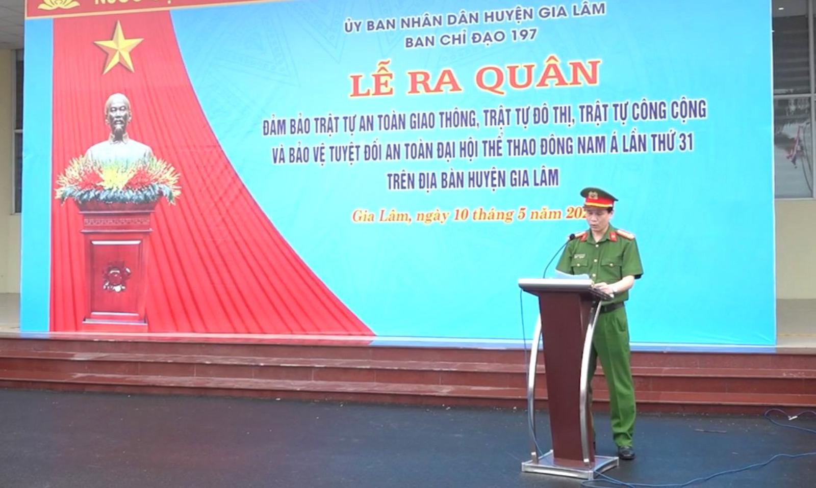 Phát biểu tại Lễ ra quân, Thượng tá Đinh Việt Phương - Phó trưởng BCĐ 197 huyện Gia Lâm cho biết: “Sự chuẩn bị chu đáo của BCĐ 197 huyện Gia Lâm về công tác đảm bảo ATGT, TTĐT, TTCC và vệ sinh môi trường đã góp phần tạo môi trường ‘sáng, xanh, sạch, đẹp’, ‘hấp dẫn, an toàn, thân thiện’ trên địa bàn. Qua đó, tin tưởng SEA Games 31 sẽ tạo ấn tượng mạnh mẽ trong mắt bạn bè quốc tế và du khách khi đến với huyện Gia Lâm nói riêng và Thủ đô Hà Nội nói chung”.