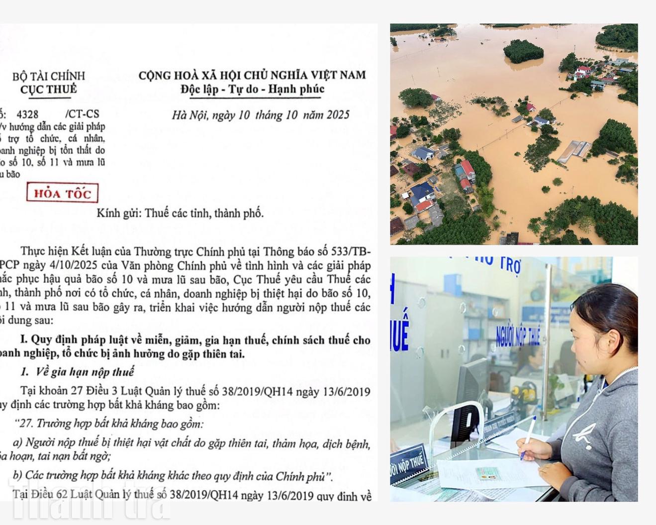 Cục Thuế cho biết, Công văn số 4328/CT-CS được ban hành nhằm thực hiện Kết luận của Thường trực Chính phủ tại Thông báo số 533/TB-VPCP ngày 4/10/2025 của Văn phòng Chính phủ về tình hình và các giải pháp khắc phục hậu quả bão số 10 và mưa lũ sau bão.
