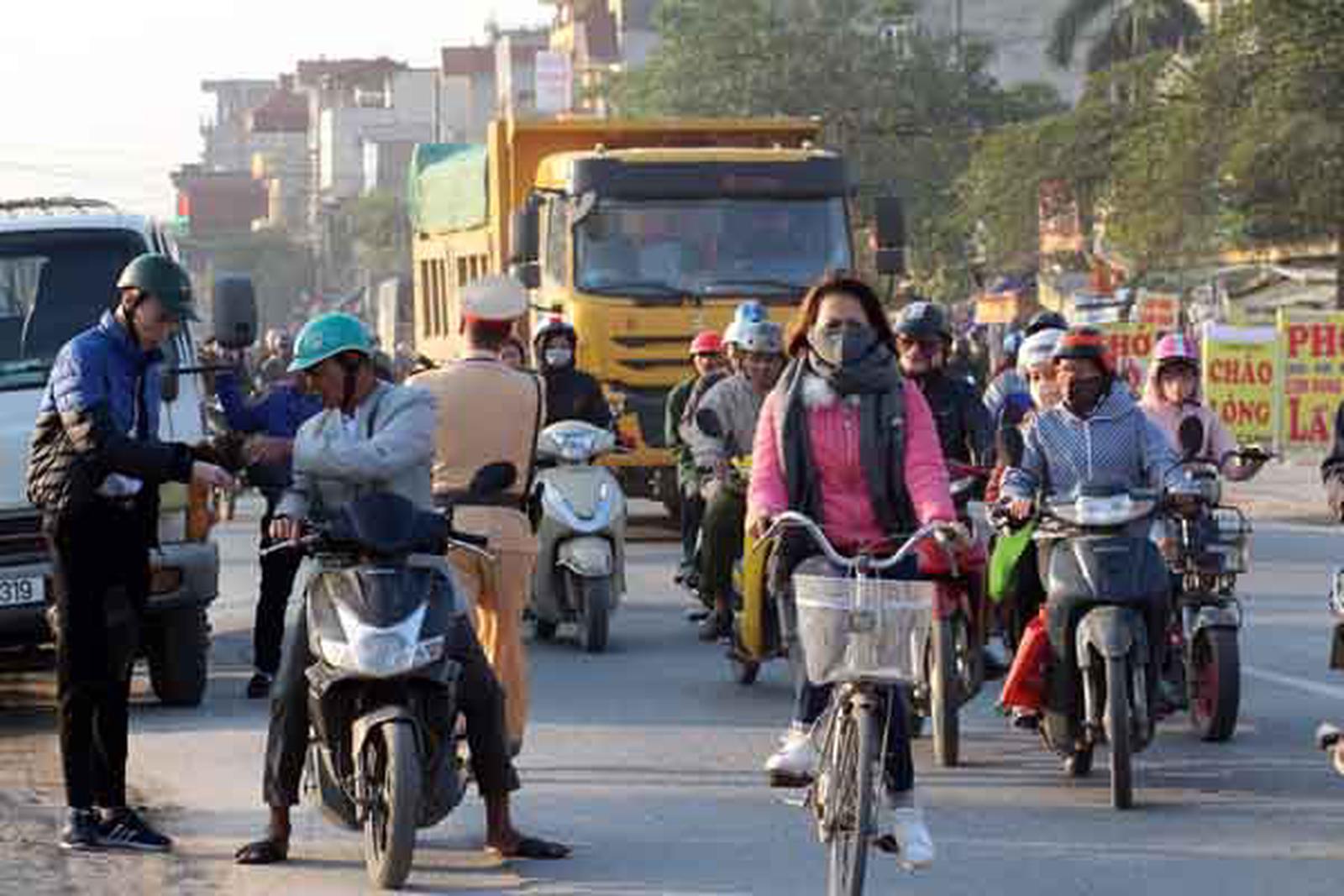 Cảnh sát giao thông hướng dẫn, phân luồng giao thông tại tuyến đường đi chùa Hương (Hà Nội). Ảnh HO