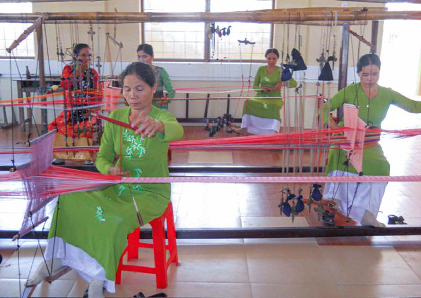 Giá trị độc đáo của thổ cẩm Mỹ Nghiệp là vẫn giữ nguyên kỹ thuật dệt thủ công từ một chiếc khung gỗ dệt. Ảnh: Khoa Lê
