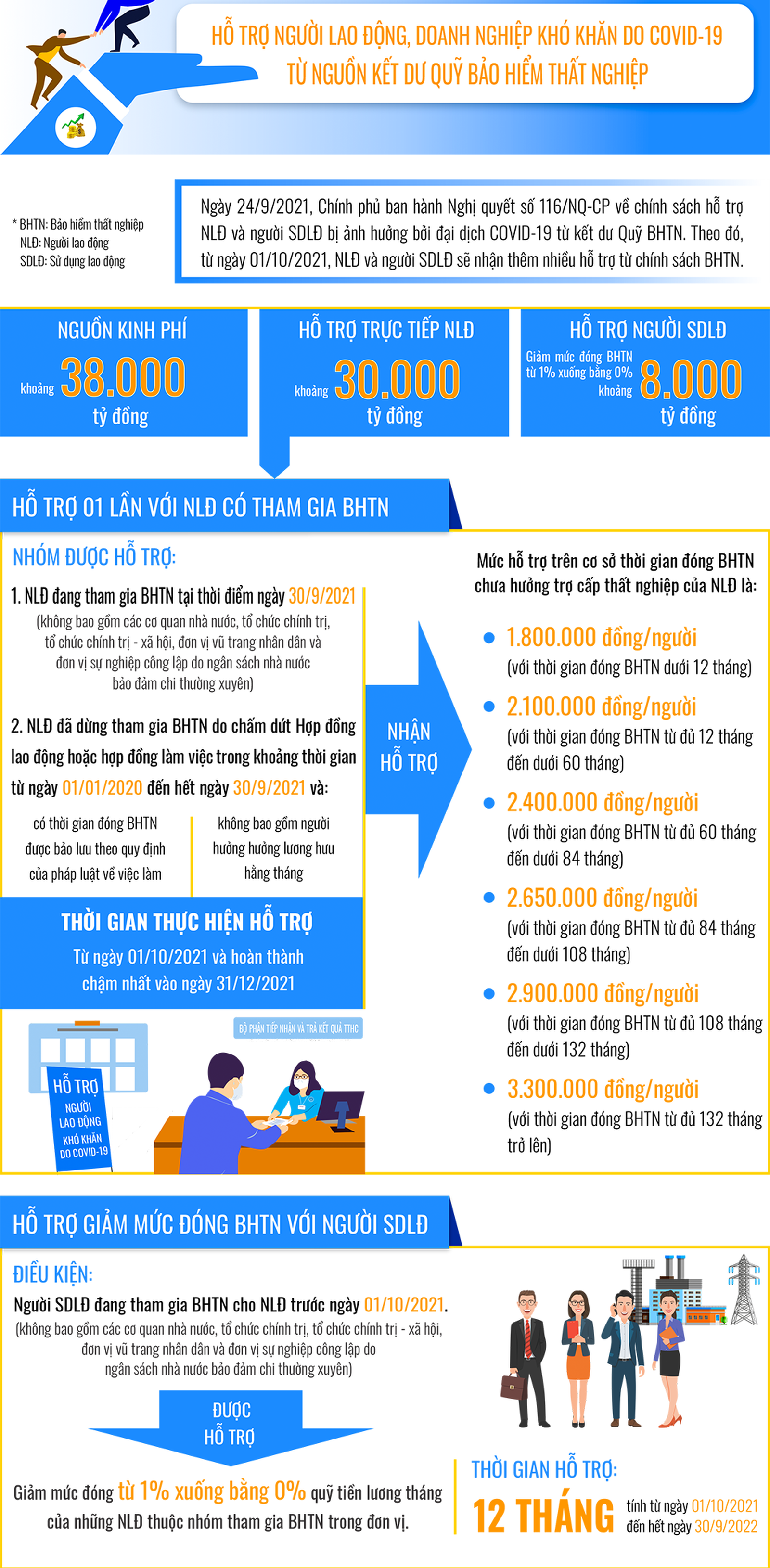 Mới đây, Chính phủ đã ban hành Nghị quyết số 116/NQ-CP về chính sách hỗ trợ NLĐ và người sử dụng lao động (NSDLĐ) bị ảnh hưởng bởi đại dịch Covid-19 từ quỹ BHTN với tổng giá trị khoảng 38 nghìn tỷ.