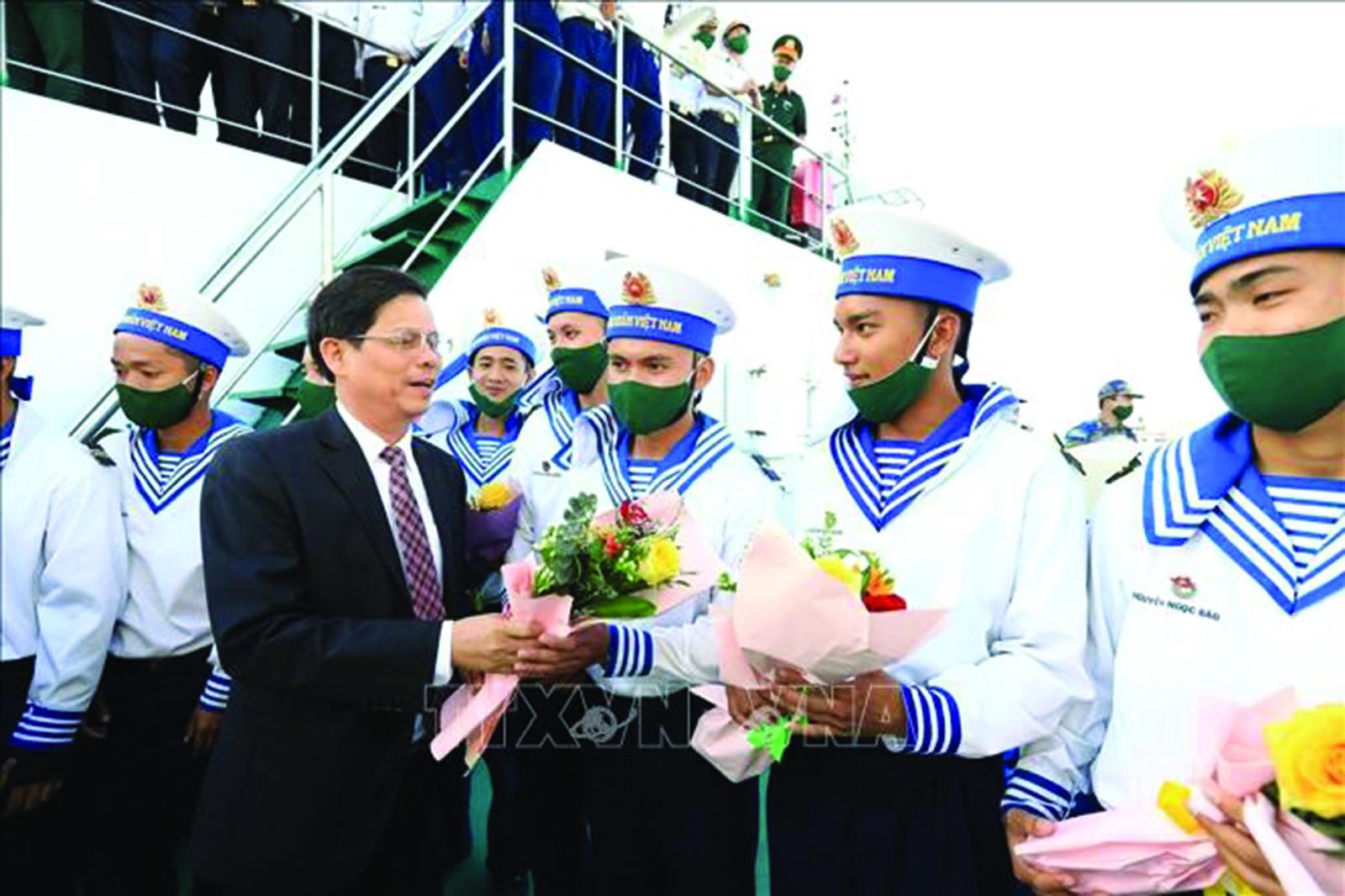 Chủ tịch tỉnh Khánh Hòa Nguyễn Tấn Tuân tặng hoa cho các chiến sĩ. Ảnh: Thành Đạt