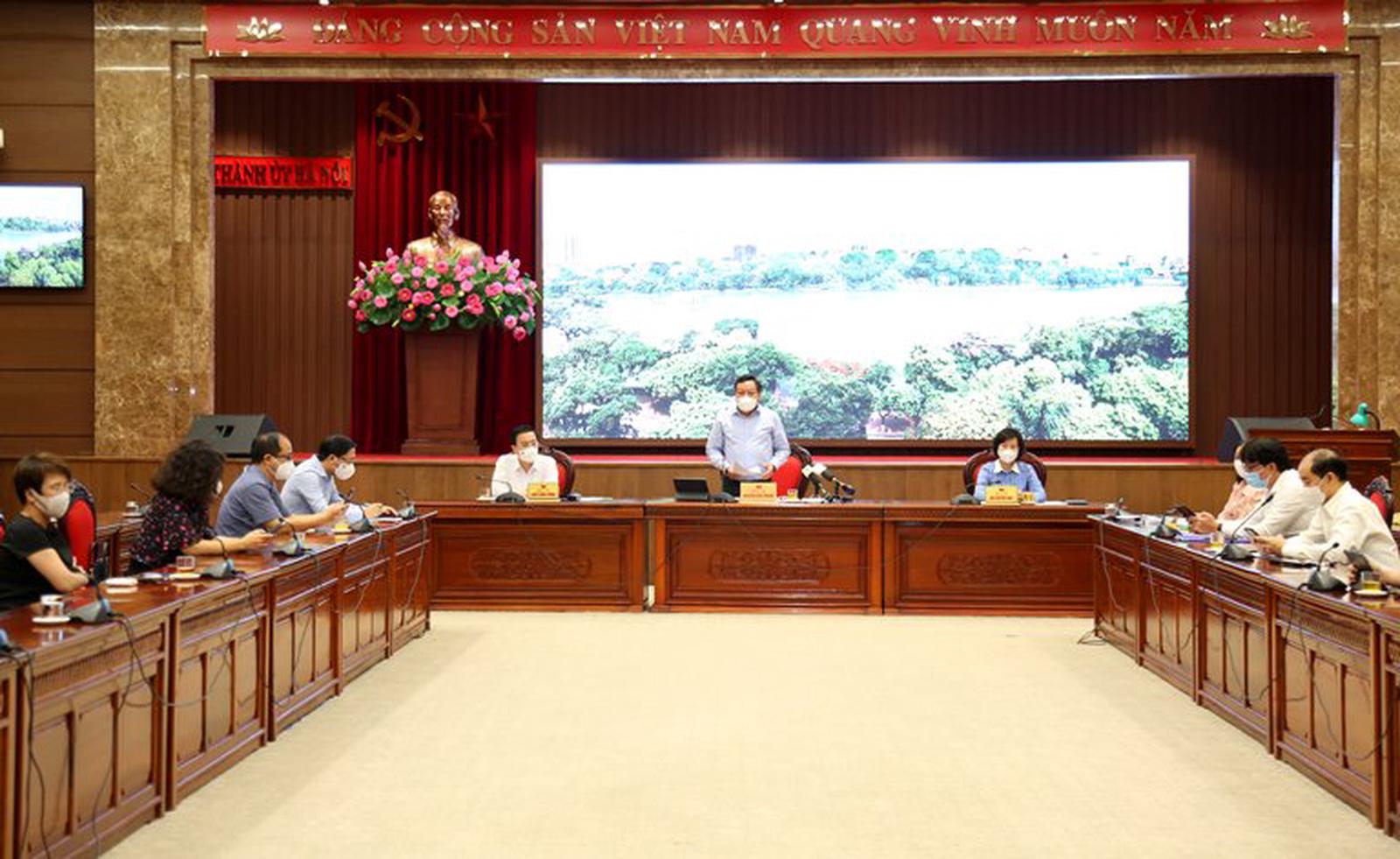Lãnh đạo Thành uỷ Hà Nội thông tin tới báo chí về công tác phòng, chống dịch khi thực hiện giãn cách xã hội. Ảnh: PV