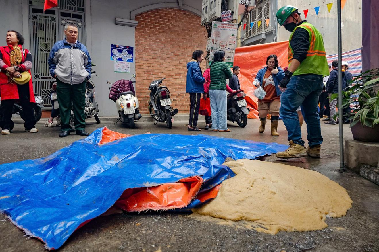Phụ gia đào hầm phun lên mặt đất tại khu vực ngõ 7 Giang Văn Minh, phường Kim Mã, quận Ba Đình, TP Hà Nội. Ảnh: TQ