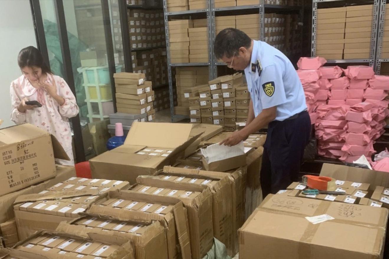 Tại hiện trường, lực lượng chức năng phát hiện 6.068 đôi guốc, 1.203 đôi dép và 239 đôi giày mang chữ "ZARA" trên sản phẩm và bao bì, nghi giả mạo nhãn hiệu.