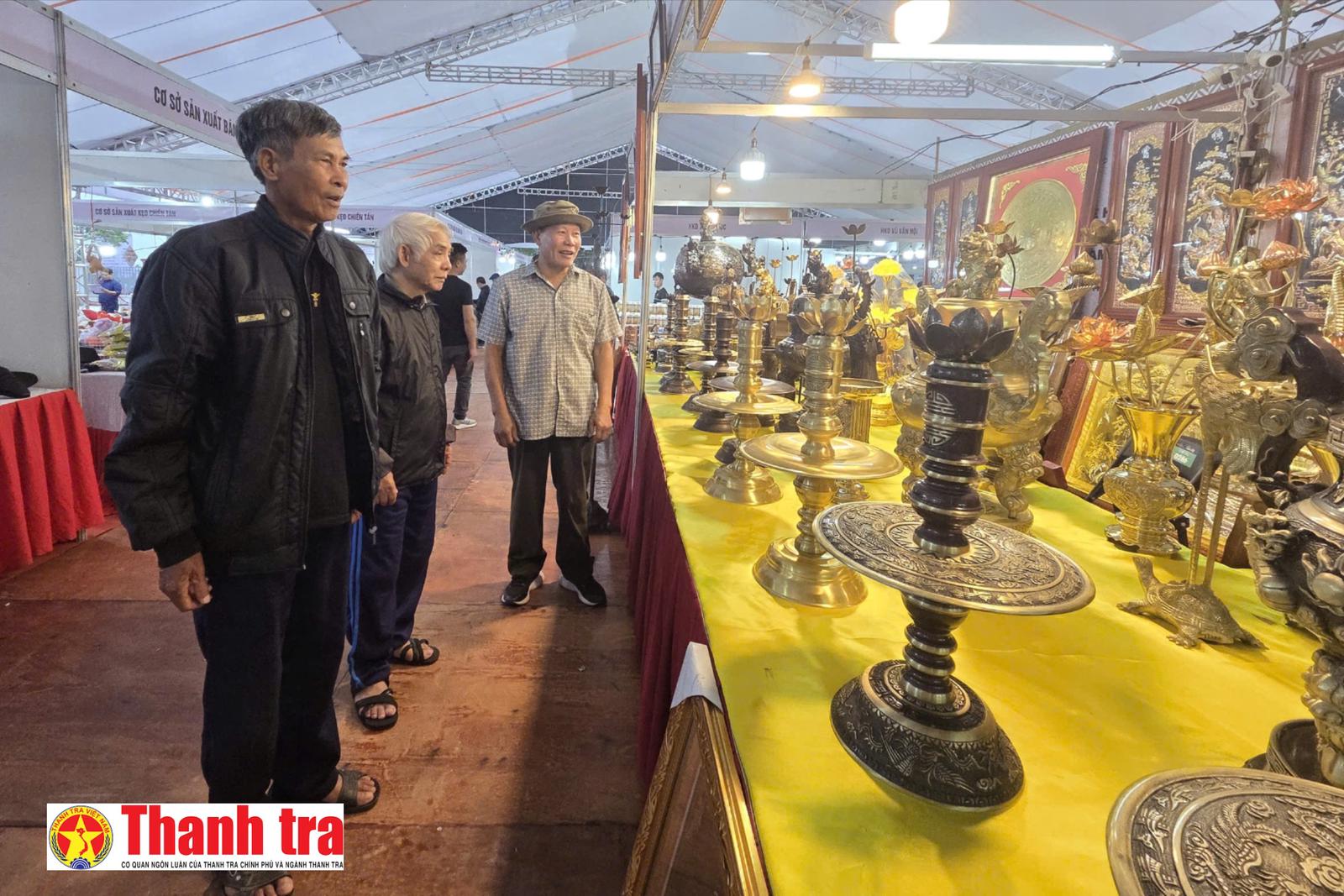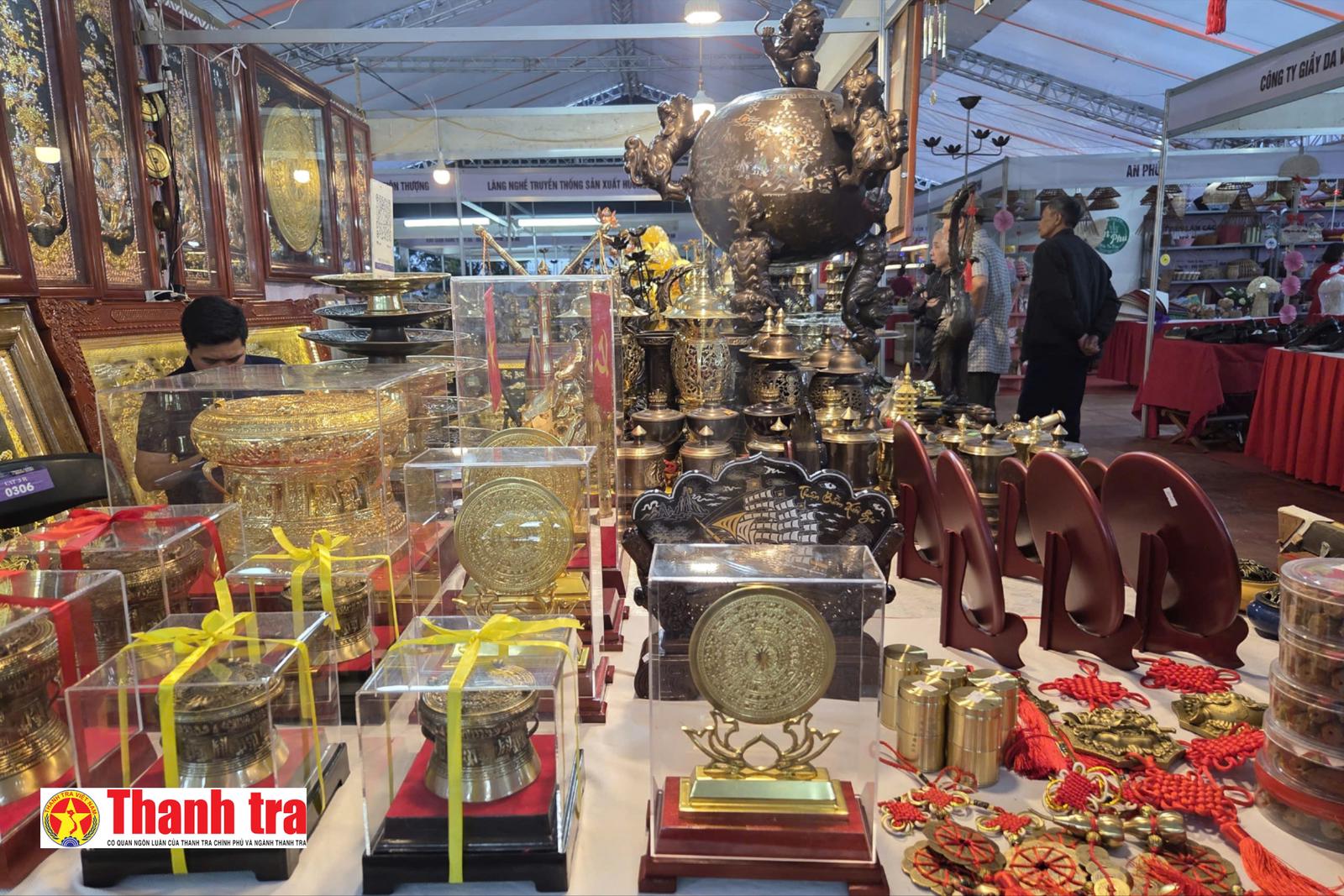 Không gian trưng bày sản phẩm đồng, gỗ, sơn mài... thu hút đông đảo du khách, góp phần quảng bá giá trị nghề thủ công và thúc đẩy tiêu thụ sản phẩm làng nghề. Ảnh: Nguyễn Thi