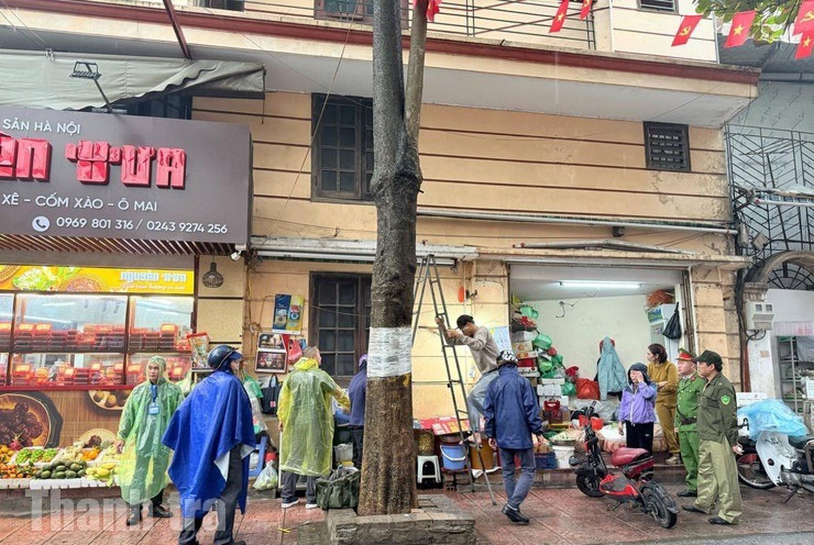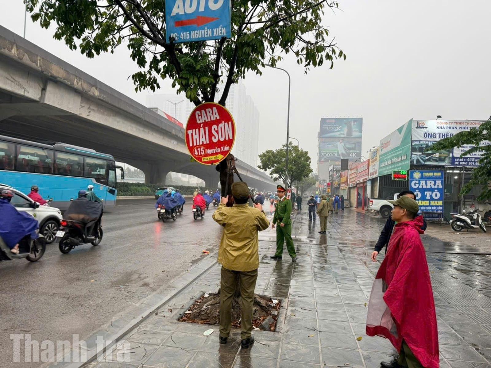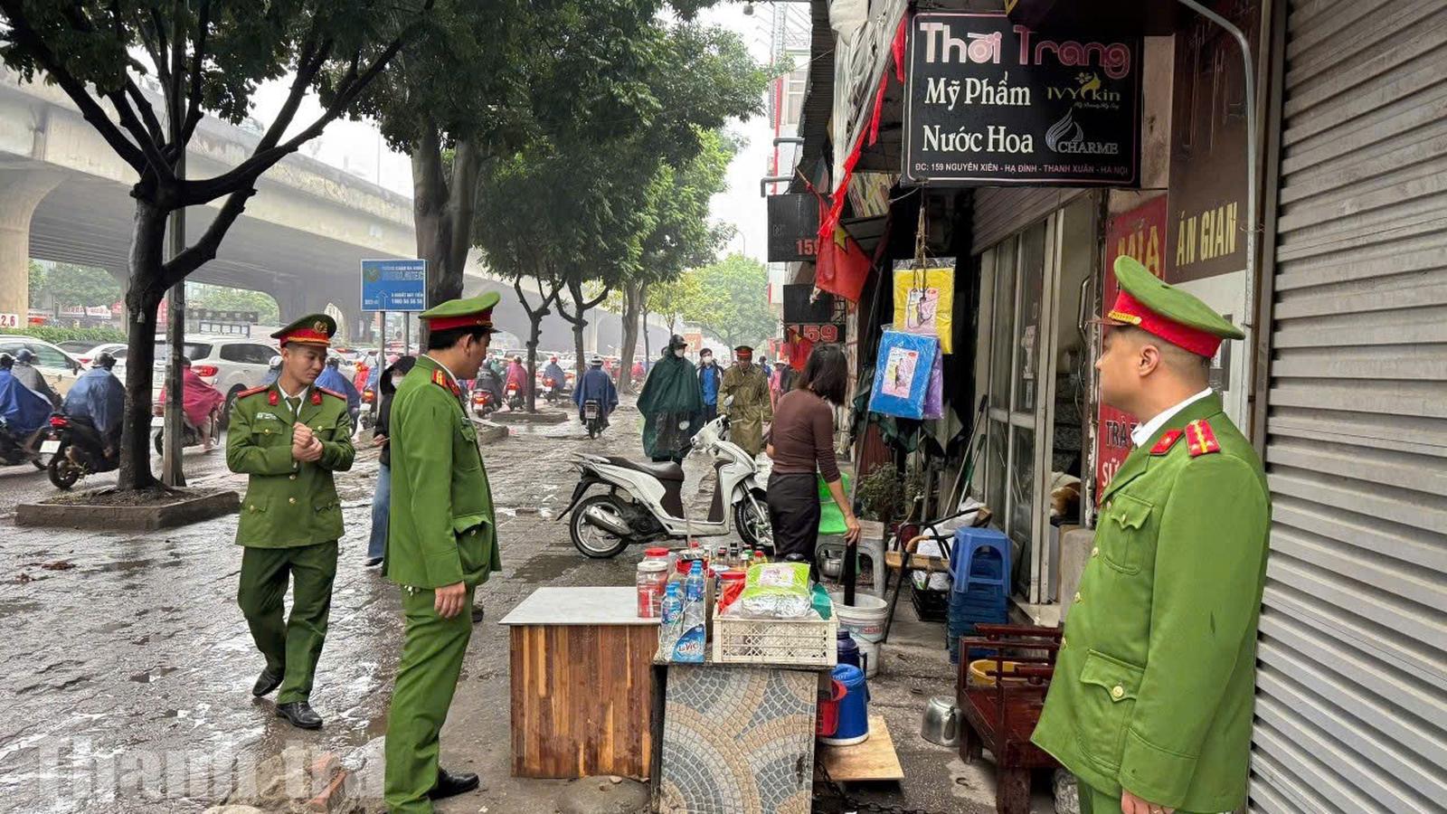 Lực lượng chức năng phường Ba Đình "đội mưa" ra quân xử lý vi phạm lòng đường, vỉa hè. Ảnh: HH