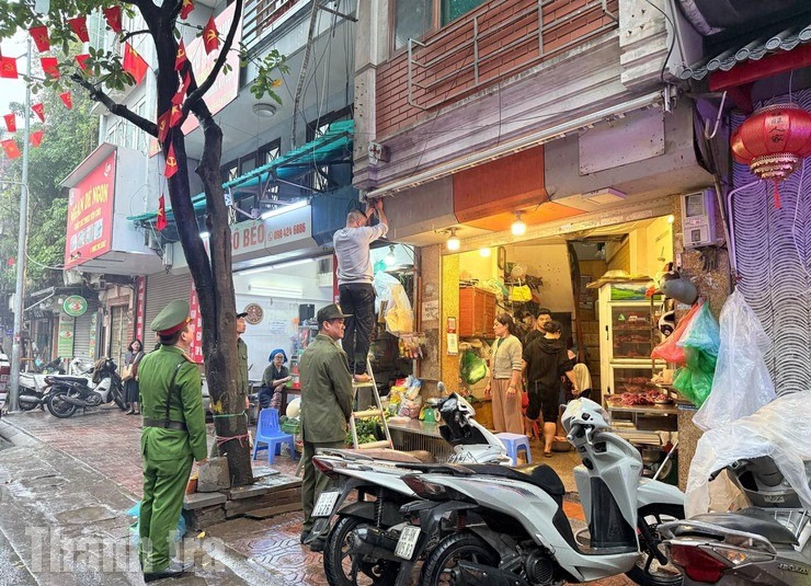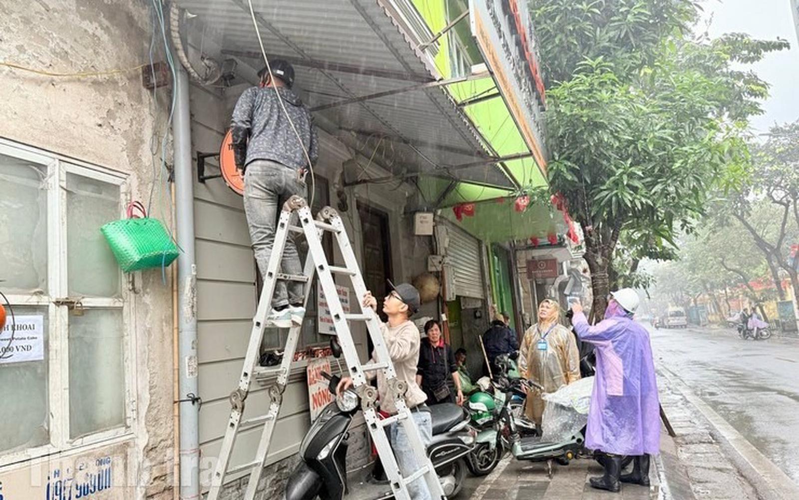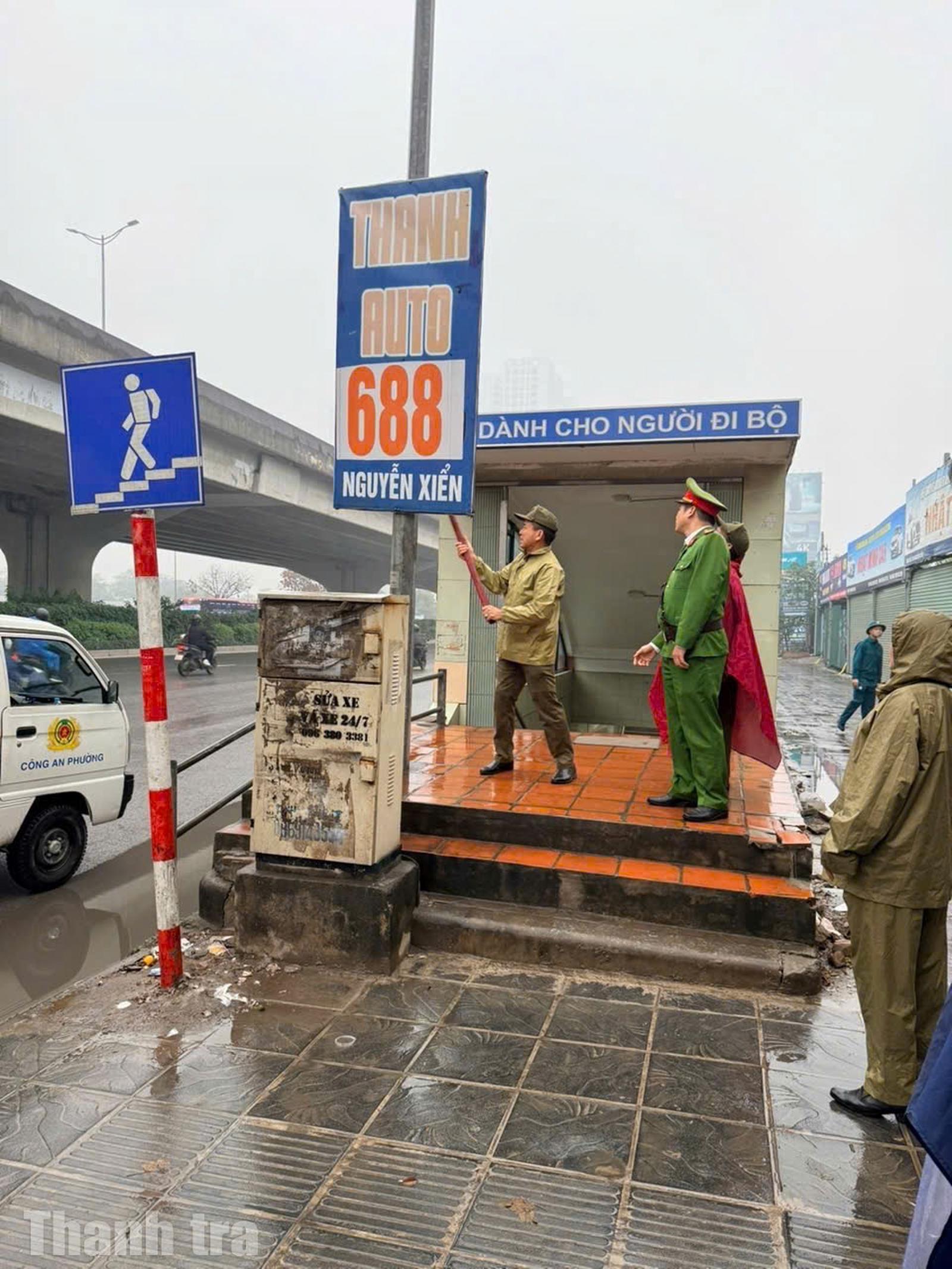 Lực lượng chức năng phường Ba Đình "đội mưa" ra quân xử lý vi phạm lòng đường, vỉa hè. Ảnh: HH