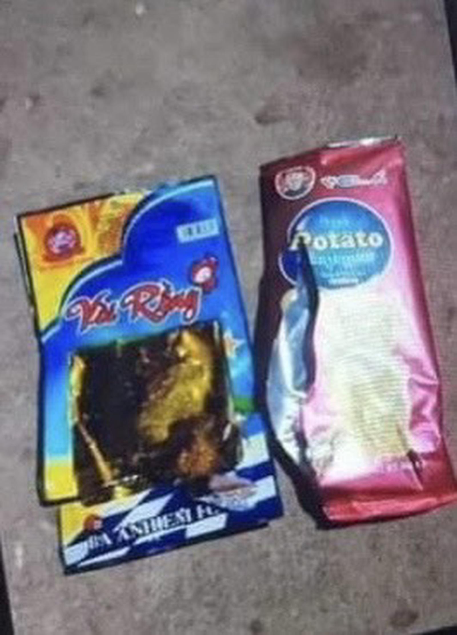 Hai gói bim bim học sinh mua tại cửa hàng tạp hoá Sơn Phẩm, thôn Bích Phương, xã Xuân Sinh, huyện Thọ Xuân, tỉnh Thanh Hoá. Ảnh: Hương Trà
