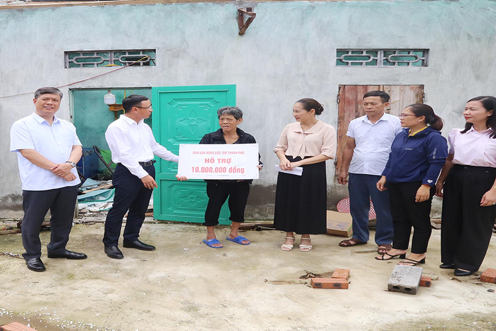 Đoàn đến thăm, động viên và trao kinh phí hỗ trợ 10 triệu đồng cho hộ bà Nguyễn Thị Két, tại thôn Cẩm Hoàn, xã Thanh Sơn, huyện Kiến Thụy, là hộ nghèo nhà bị tốc mái hoàn toàn trong bão số 3 vừa qua.
