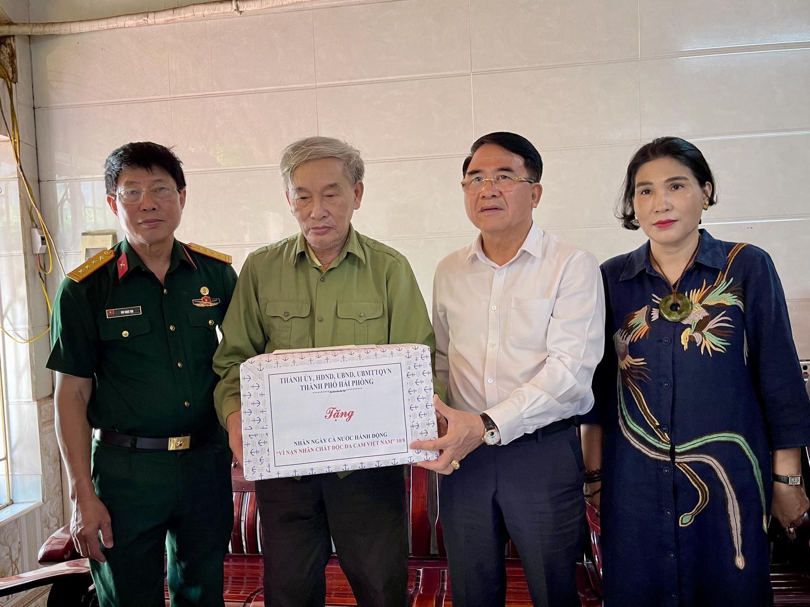 Phó Chủ tịch UBND thành phố Lê Khắc Nam cùng đoàn đến thăm, tặng quà các gia đình nạn nhân chất độc da cam/dioxin, gồm: Ông Nguyễn Ngọc Huy, sinh năm 1953, người hoạt động kháng chiến bị nhiễm chất độc hóa học, có 2 con là nạn nhân da cam dị dạng dị tật (1 con vừa mới chết tháng 6/2024) tại ngõ 91, tổ dân phố 6 mới, phường Thành Tô, quận Hải An; chị Phạm Thị Luận, sinh năm 1987, nạn nhân da cam tỷ lệ tổn thương cơ thể 81% trở lên, bố đẻ là nạn nhân da cam (bố mẹ đẻ đã chết, hiện đang ở với chị gái), tại tổ dân phố Bình Kiều 2, phường Đông Hải 2, quận Hải An; ông Nguyễn Văn Mỹ, sinh năm 1954, người hoạt động kháng chiến bị nhiễm chất độc hóa học, có 4 con, 1 con trai đang hưởng chế độ con người nhiễm chất độc hóa học tại thôn Đồng Mát, xã Thủy Đường, huyện Thủy Nguyên; bà Phạm Thị Túy, sinh năm 1954 (vợ ông Nguyễn Viết Nam, là người nhiễm chất độc hóa học, đã chết), có 3 con, một mình chăm 2 con trai đang hưởng chế độ con người nhiễm chất độc hóa học tại thôn 1A, xã Lưu Kiếm, huyện Thủy Nguyên.
