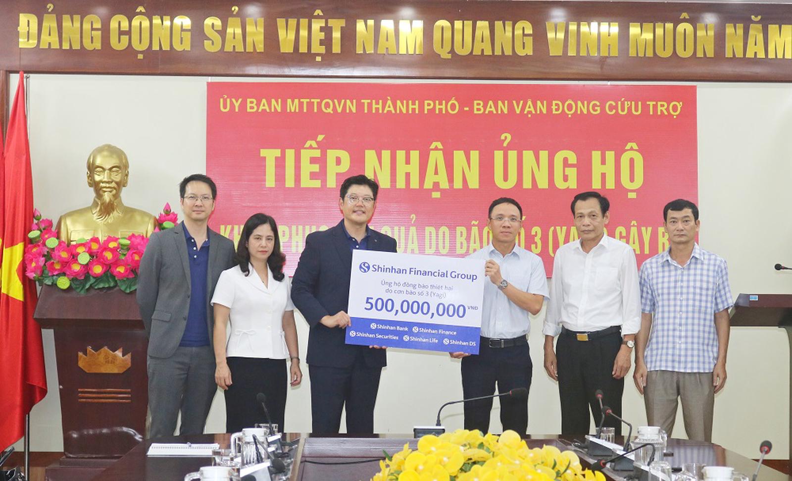 Tiếp nhận ủng hộ Nhân dân bị thiệt hại do cơn bão số 3 gây ra từ Hệ sinh thái tài chính Shinhan tại Việt Nam với số tiền 500 triệu đồng. Thay mặt Ủy ban MTTQ Việt Nam - Ban Vận động cứu trợ thành phố, Chủ tịch Ủy ban MTTQ Việt Nam thành phố Đào Trọng Đức trân trọng cám ơn sự ủng hộ, sẻ chia của hệ sinh thái tài chính Shinhan. Đồng thời cam kết Ban Thường trực Ủy ban MTTQ Việt Nam thành phố sẽ có phương án hỗ trợ kịp thời, công khai, đúng đối tượng bị thiệt hại, trước mắt là hỗ trợ kinh phí khôi phục nhà ở cho Nhân dân, đảm bảo an sinh xã hội trên địa bàn thành phố.