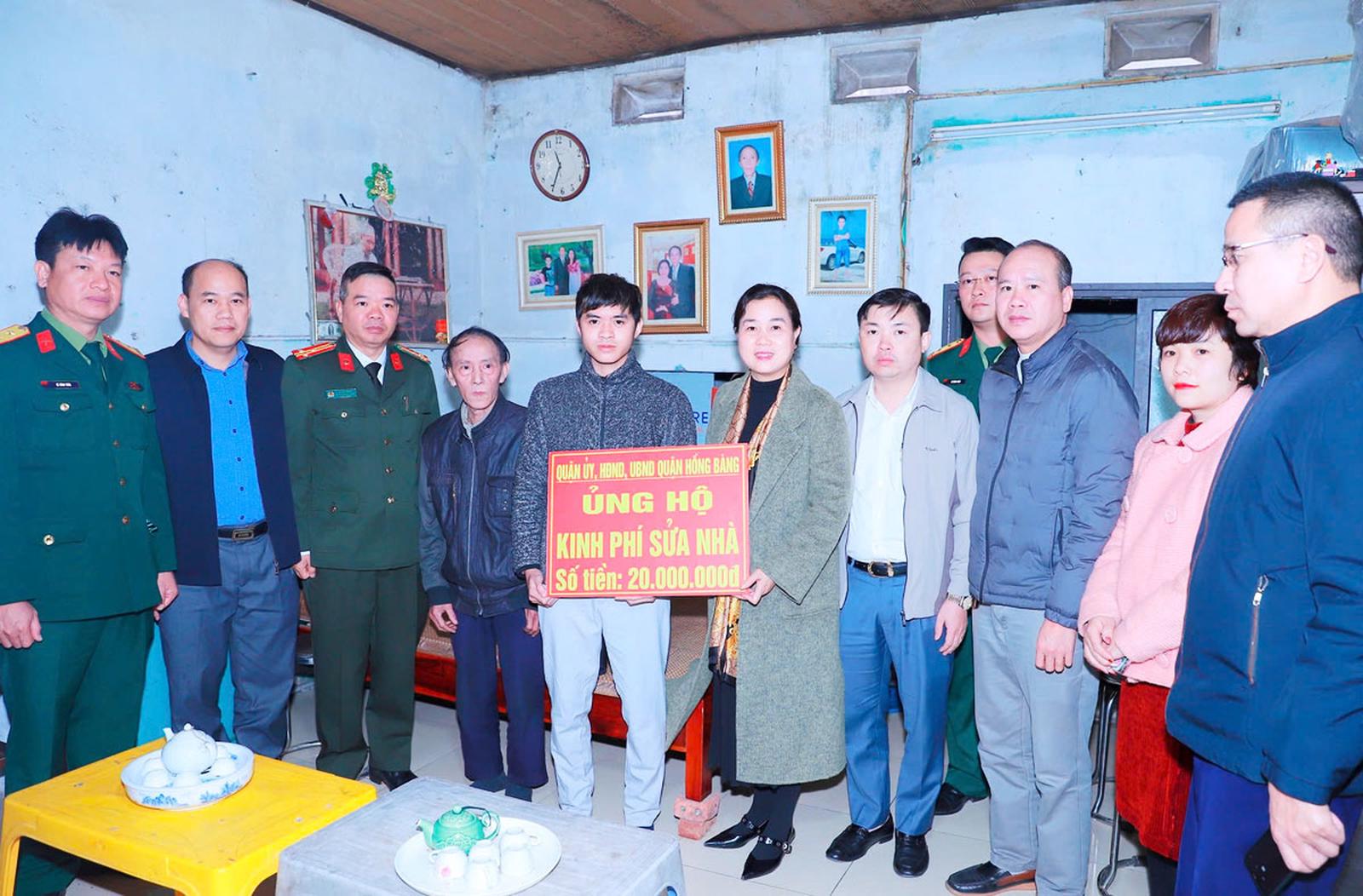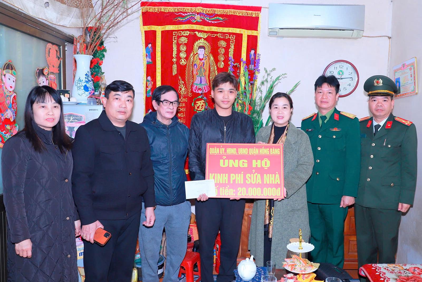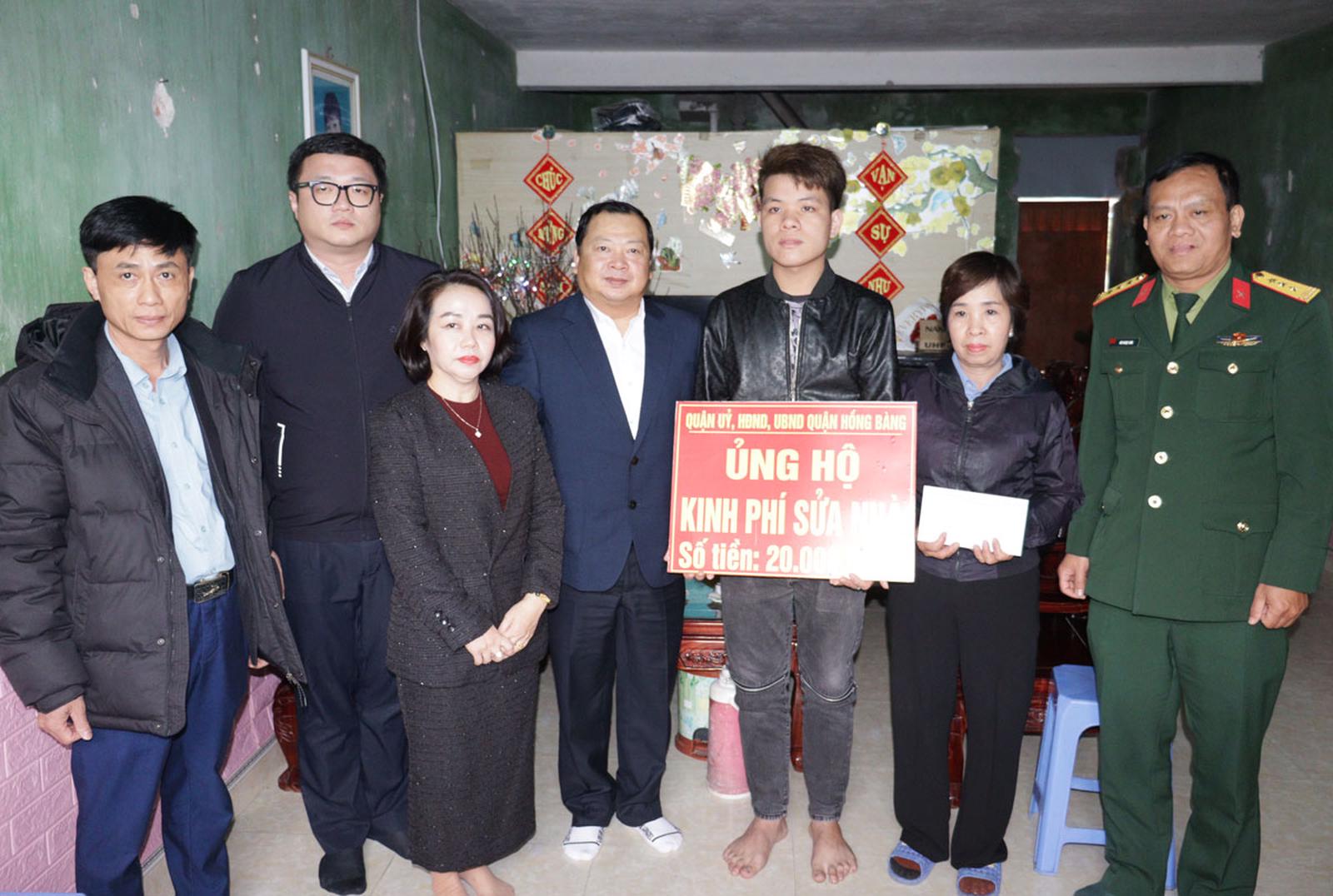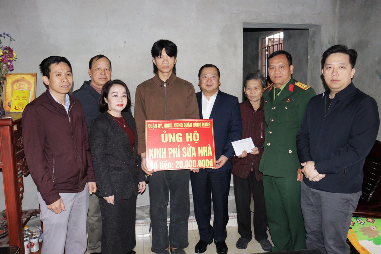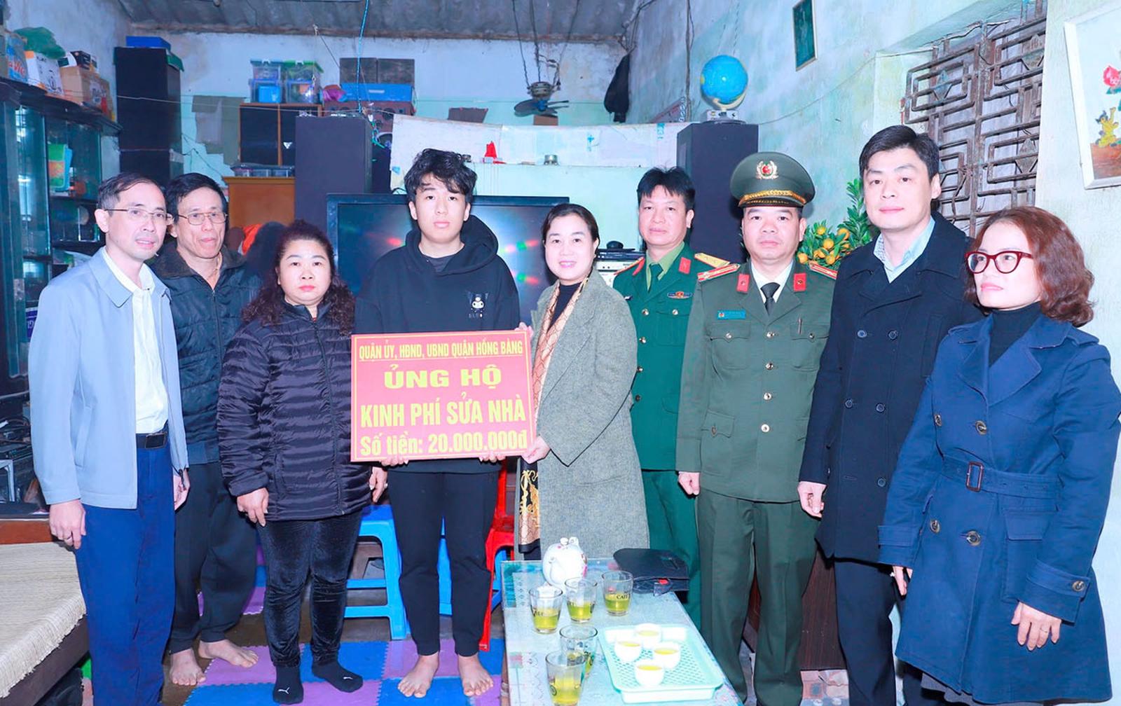 Lãnh đạo quận Hồng Bàng trao kinh phí sửa chữa nhà cho công dân Hoàng Việt Hùng, ở số 113/350 đường Hùng Vương, phường Sở Dầu. Ảnh: TT