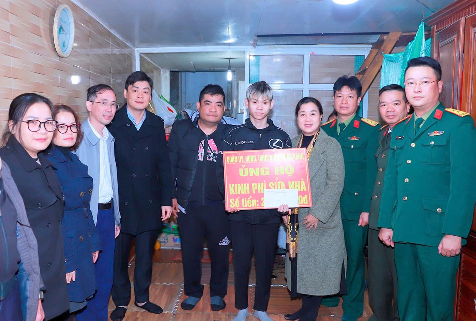Lãnh đạo quận Hồng Bàng trao khi phí sửa chữa nhà cho công dân Nguyễn Hoàng Trung Dũng, tại Tổ dân phố Trại Kênh, phường Đại Bản. Ảnh: TT