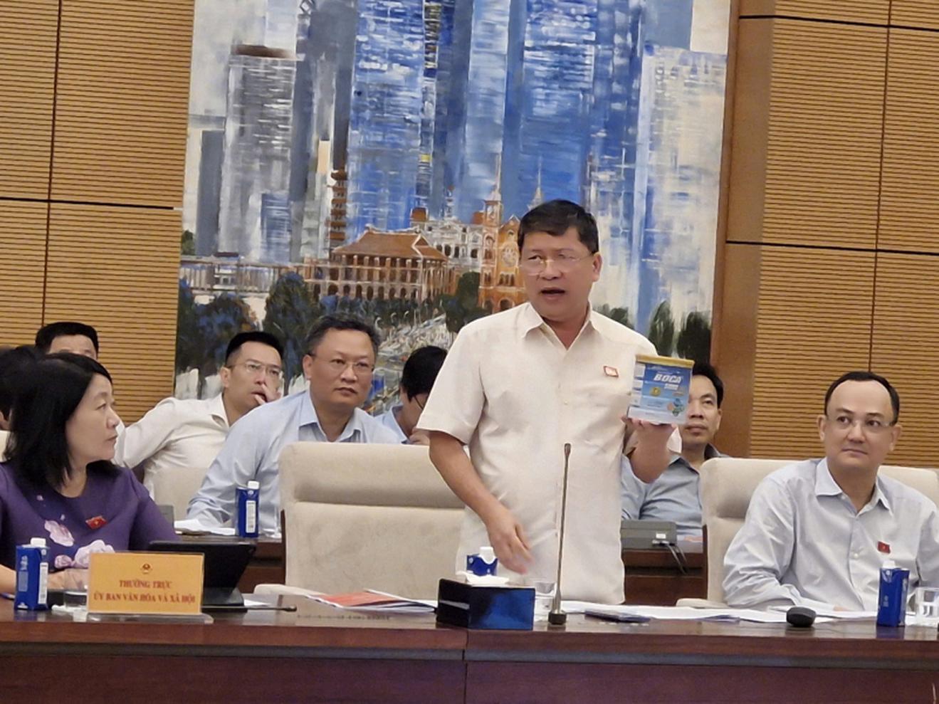 ĐBQH Tạ Văn Hạ đã mang theo một hộp sữa “nghi giả” đến phiên giải trình. Ảnh: QH