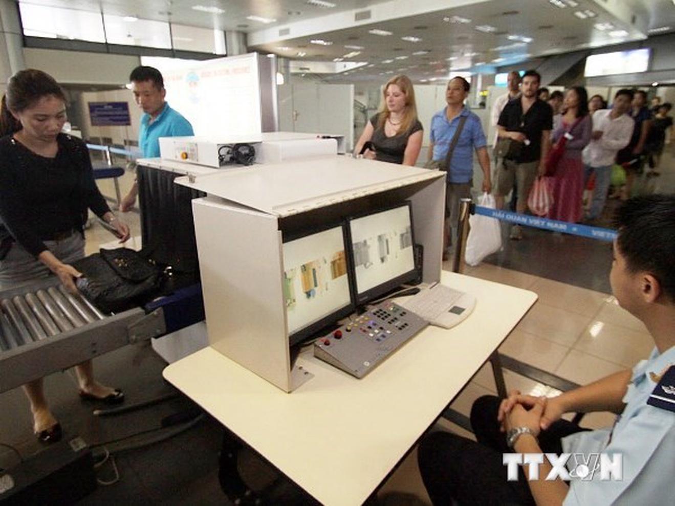 Lực lượng chức năng soi chiếu hành lý hành khách trước khi lên máy bay. (Ảnh: TTXVN)