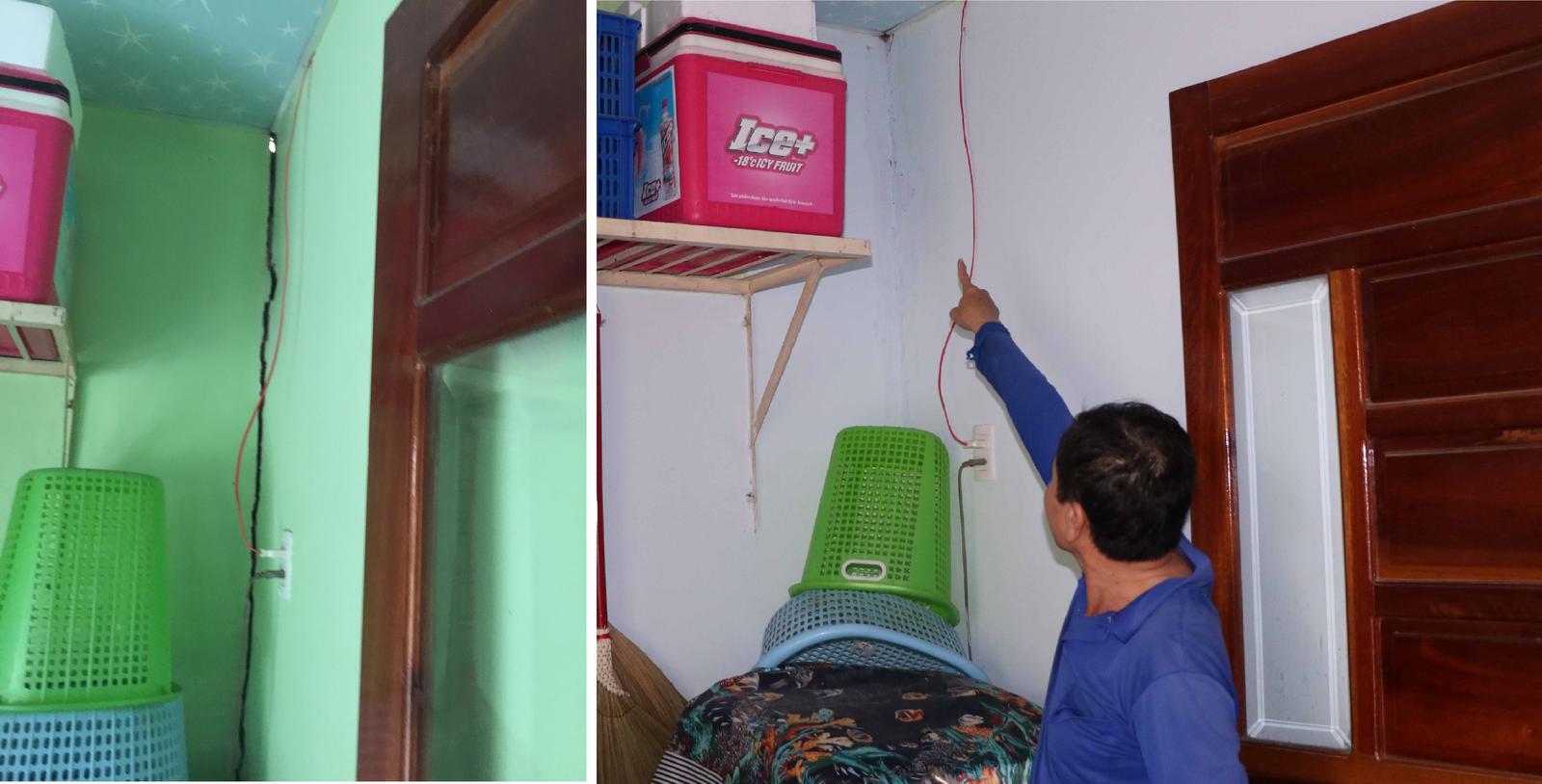 Nhà ông Phạm Chí Dũng ở thôn Đắc Nhơn bị nứt một đường dài (trái). Ảnh: Khoa Lê