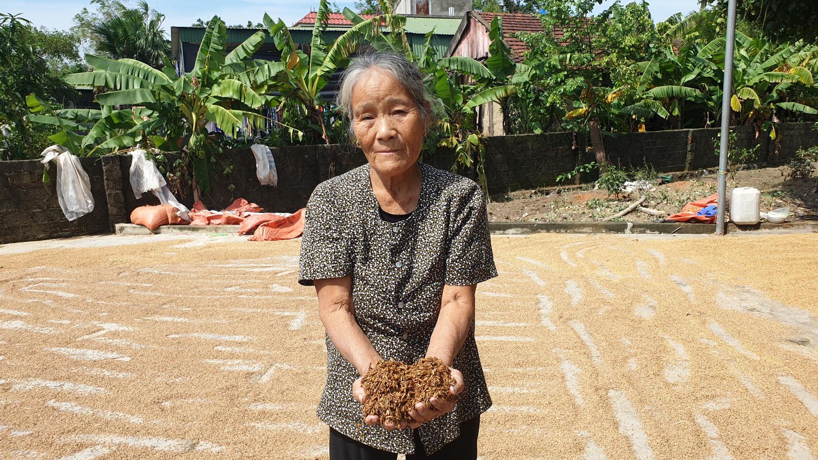 Bà Dương Thị Hòa, xã Tượng Sơn buồn bã phơi lại số lúa đã bị ngâm nước nhiều ngày qua. Ảnh: Hải Yến