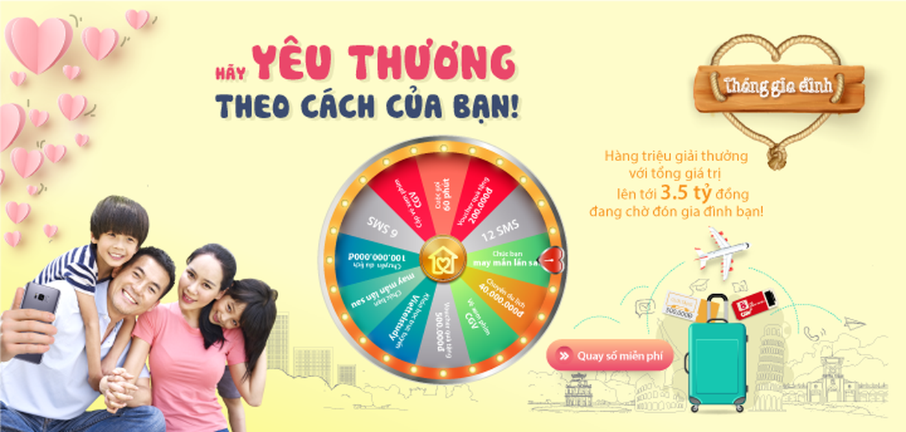 Đặc biệt, trong tháng này, Viettel dành tặng hàng triệu phần quà đặc biệt với tổng giá trị lên đến 3,5 tỷ đồng thông qua chương trình quay số may mắn “Hãy yêu thương theo cách của bạn”. Các món quà mang ý nghĩa kết nối từng thành viên trong gia đình như voucher du lịch, voucher mua sắm, xem phim, khóa học tập trực truyến cho các con, miễn phí tin nhắn và phút gọi … Thông tin chi tiết mời truy cập https://viettel.vn/giadinh hoặc vào ứng dụng My Viettel.