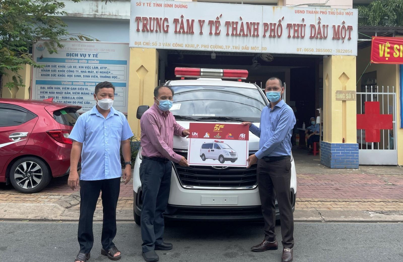 Ông Nguyễn Hữu Tùng (bên phải), đại diện Hệ thống 5F trao xe cho Phó Chủ tịch UBND TP Thủ Dầu Một Trần Sĩ Nam và Giám đốc Trung tâm Y tế TP Nguyễn Văn Đức