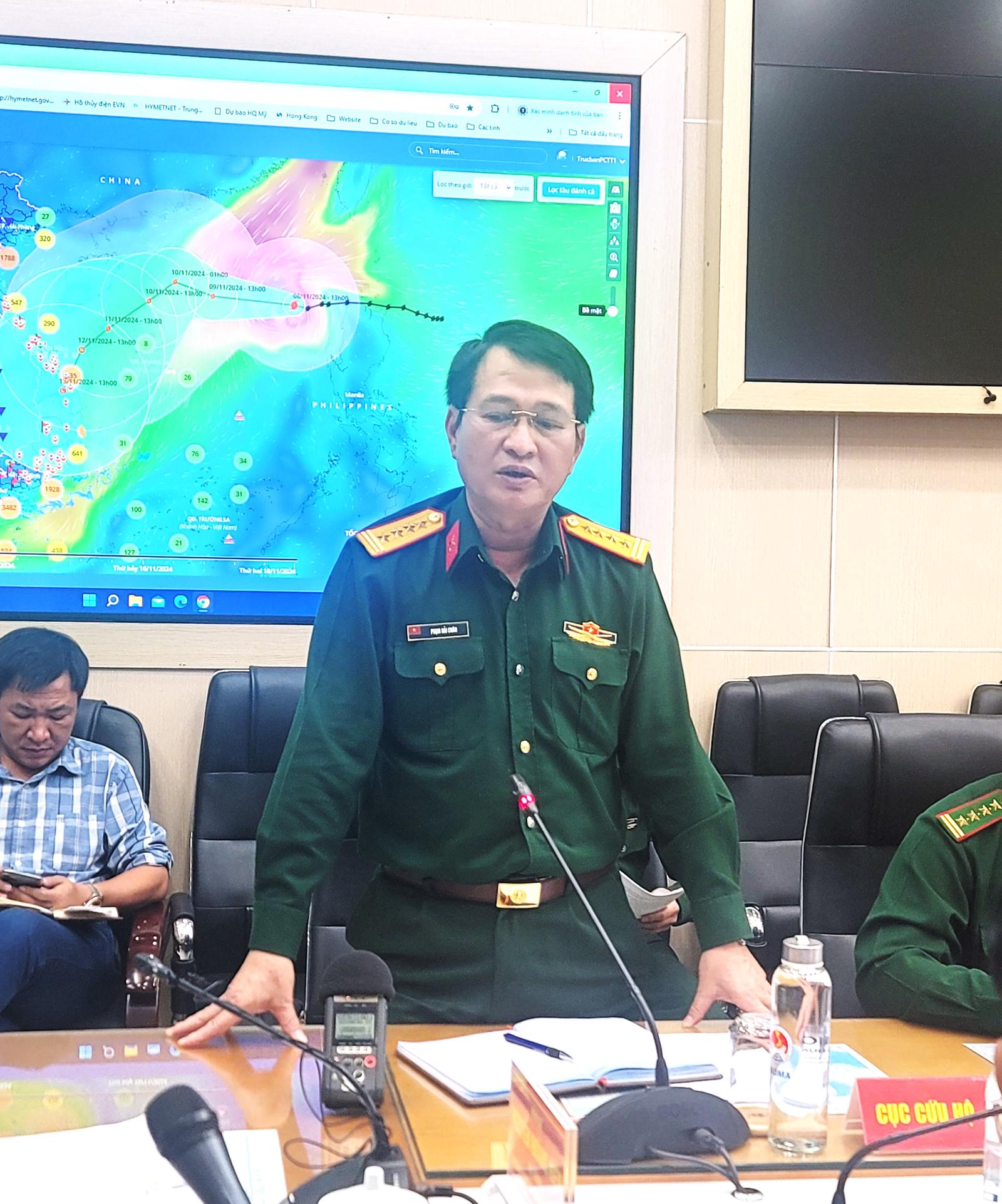 Đại tá Phạm Hải Châu, Phó Cục trưởng Cục Cứu hộ, cứu nạn, Bộ Quốc phòng phát biểu tại cuộc họp. Ảnh: Hoàng Nam