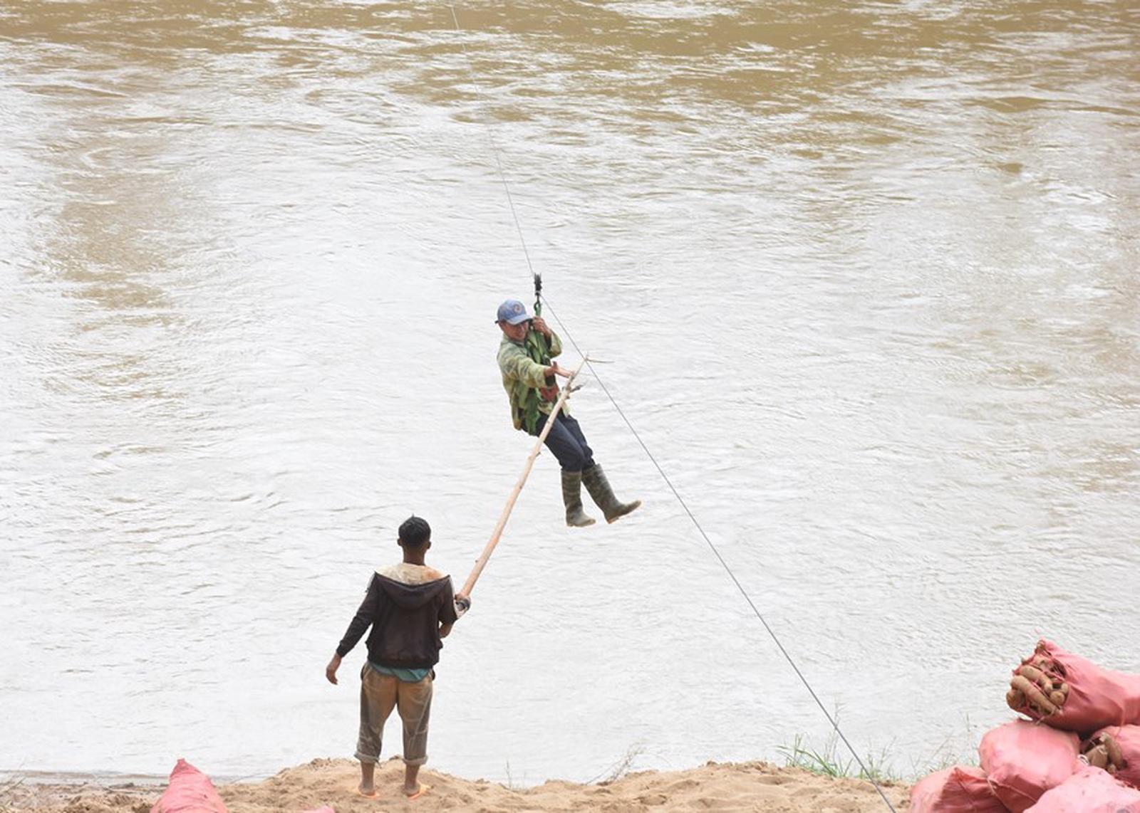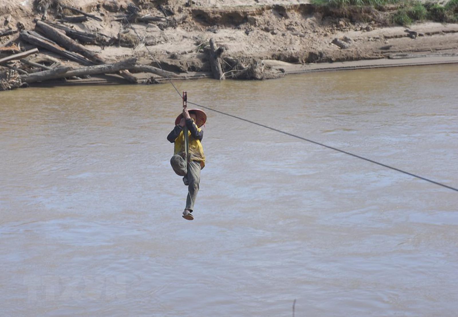 Người dân liều mình đu dây qua sông Pô Kô để mua lương thực. (Ảnh: Khoa Chương/TTXVN)