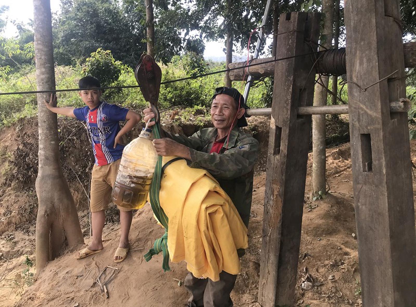 Nông sản được người dân vận chuyển bằng đường cáp treo qua sông. (Ảnh: Khoa Chương/TTXVN)