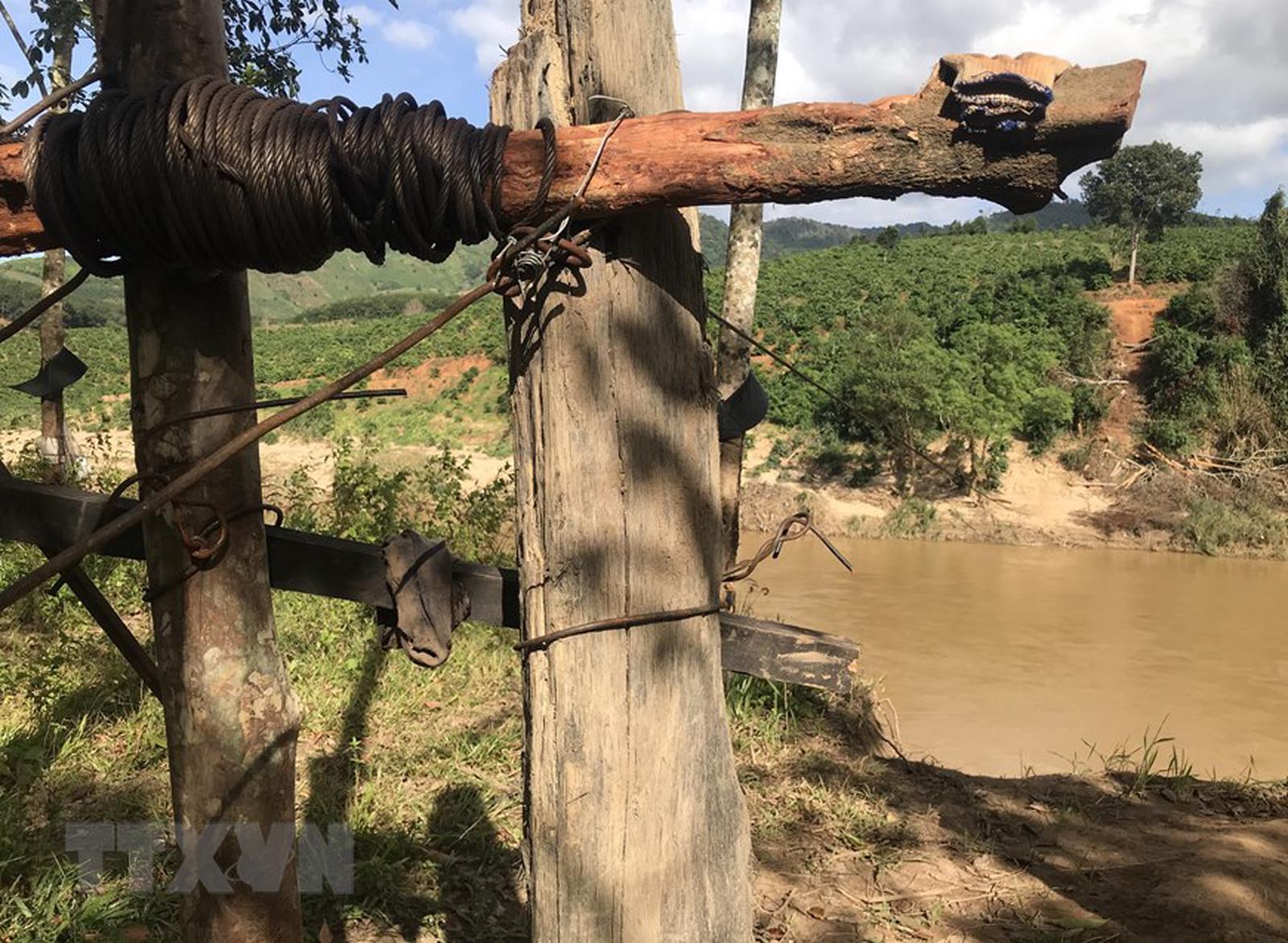 Người dân liều mình đu dây qua sông Pô Kô. (Ảnh: Khoa Chương/TTXVN)