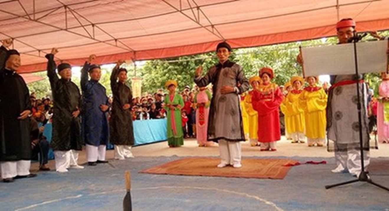 Chiếc mũ cổ của thành hoàng làng được đặt ở vị trí cao nhất trên đài thề. Các lãnh đạo địa phương và người dân dự lễ ngồi theo thứ tự phía dưới.
