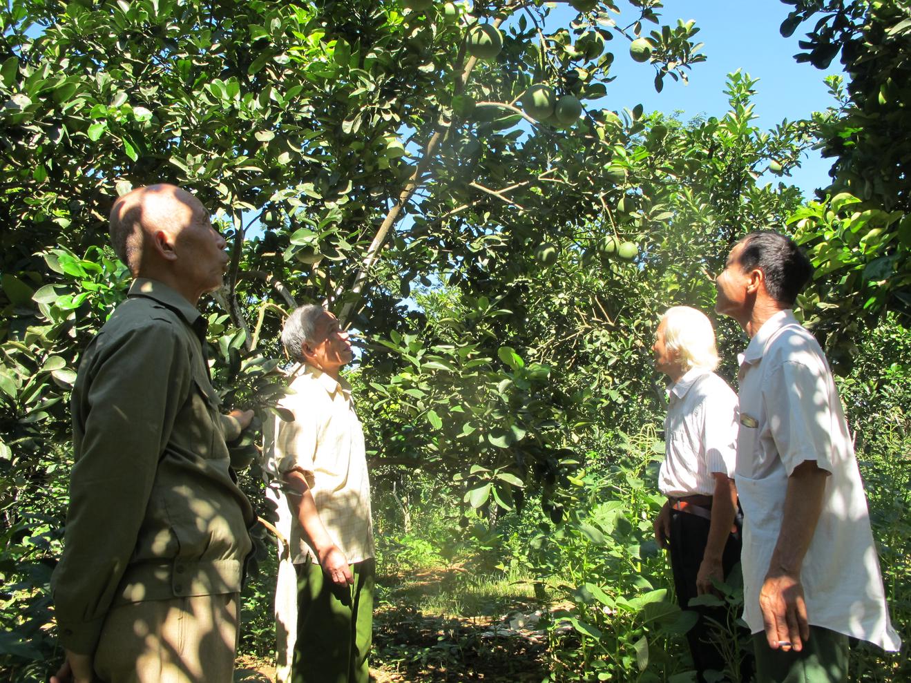 Hội viên Hội NNCĐDC/dioxin xã Yên Bình thăm mô hình trồng cây ăn quả của nạn nhân CĐDC Phùng Khắc Nga. Ảnh: Đức Long