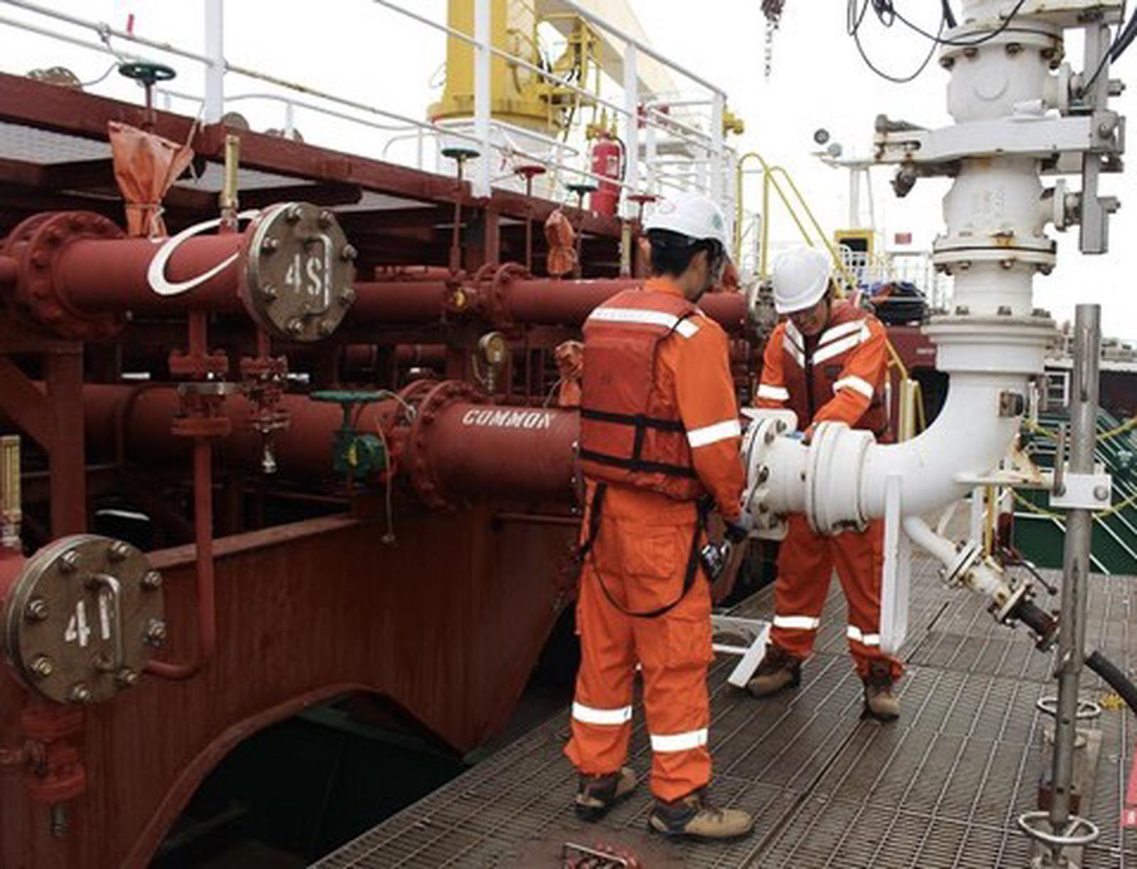 Công nhân đang bơm dầu lên tàu để xuất bản. Ảnh: HT