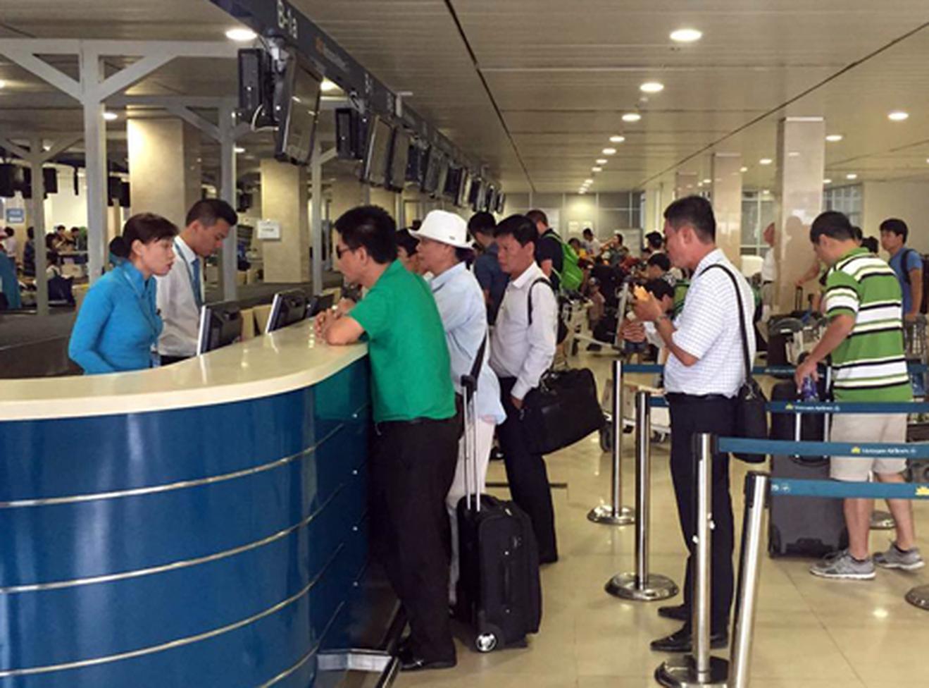 Hành khách chờ làm thủ tục check-in sau sự cố tin tặc tấn công. Ảnh:Bá Đô.
