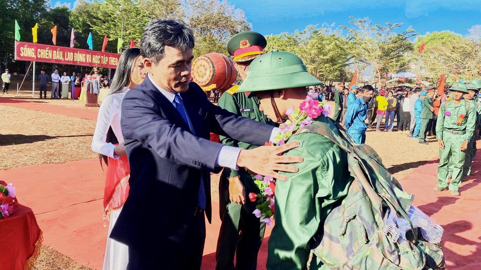 Bí thư Tỉnh ủy Kon Tum Dương Văn Trang trao quà và động viên các tân binh. Ảnh: N.G